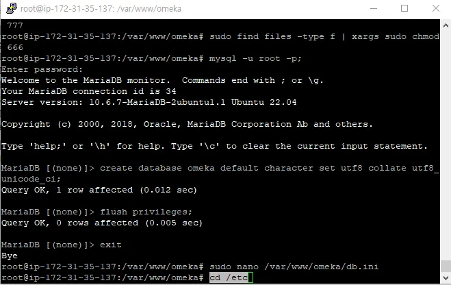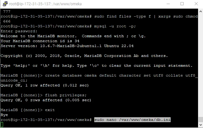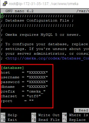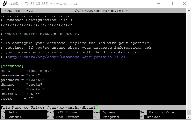 나노 에디터로 omeka 디렉토리에 있는 db 설정 파일을 엽니다.