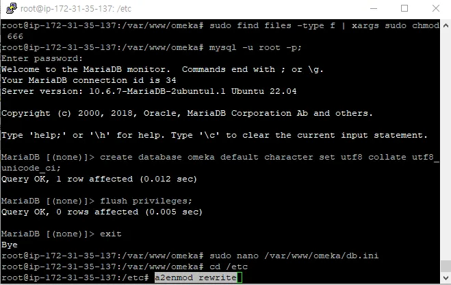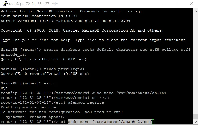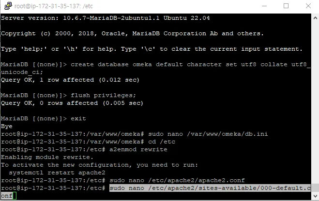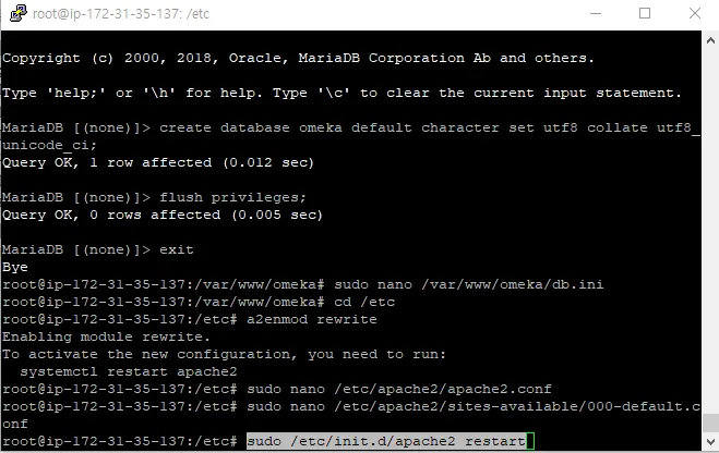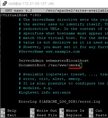 “DocumentRoot /var/www/html” 항목을 DocumentRoot /var/www/omeka 으로 변경해, 퍼블릭IP로 접속 시 오메카 페이지로 연결되도록 설정을 변경하고, ctrl+o, 엔터, ctrl+x로 저장 후 닫아 줍니다.