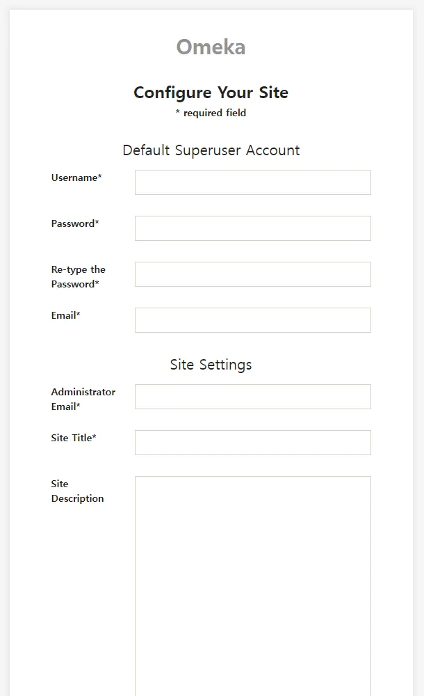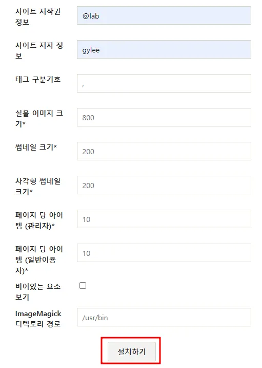성공적으로 설치되었다면 위와 같이 사이트 구성 항목이 나타납니다. 좌측은 기본 영문 버전, 우측은 한글패치 적용 버전입니다. 필수항목과 선택항목을 적절히 입력합니다.
