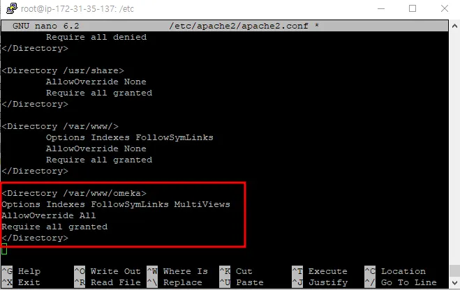 나노 에디터로 아파치 환경 설정 파일을 열어, Omeka용 디렉토리의 Access 규칙을 수정합니다.