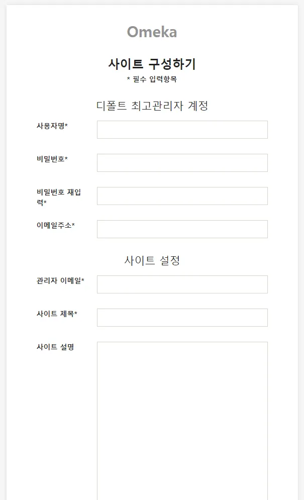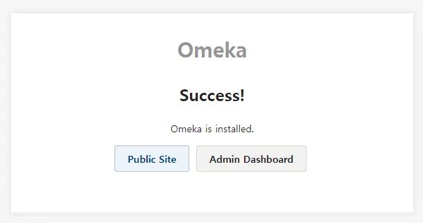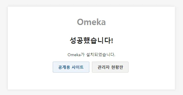 오류 없이 항목을 전부 입력하면, 오메카의 설치가 완료됩니다. 오메카는 공개 사이트와 관리자 사이트가 구분되어 있습니다