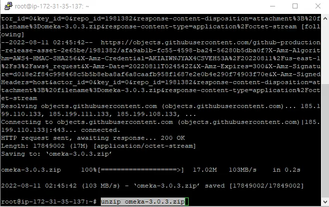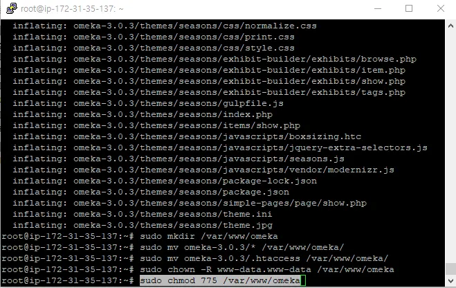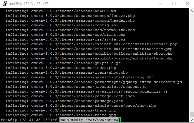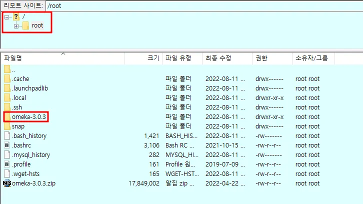 다운 받은 오메카 패키지 zip 파일의 압축을 해제합니다. 현재는 확인할 수 없지만, 이 과정에서 root 디렉토리에 omeka-3.1.2 폴더가 생성됩니다.