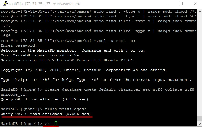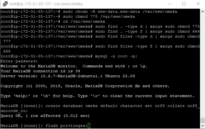 Omeka용 데이터베이스 생성 및 권한을 설정하기 위해, mysql 데이터베이스 관리자 모드로 접속합니다.