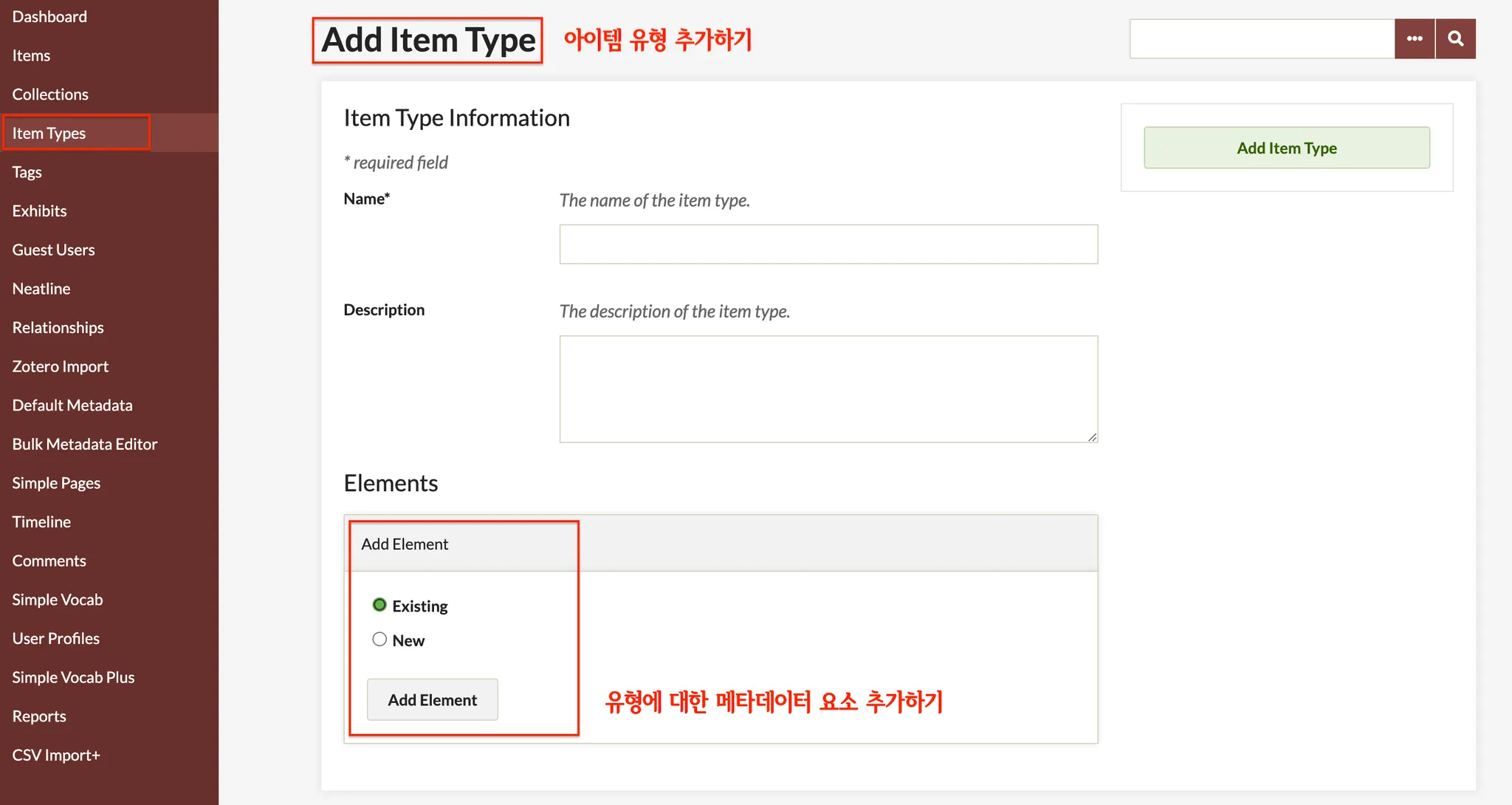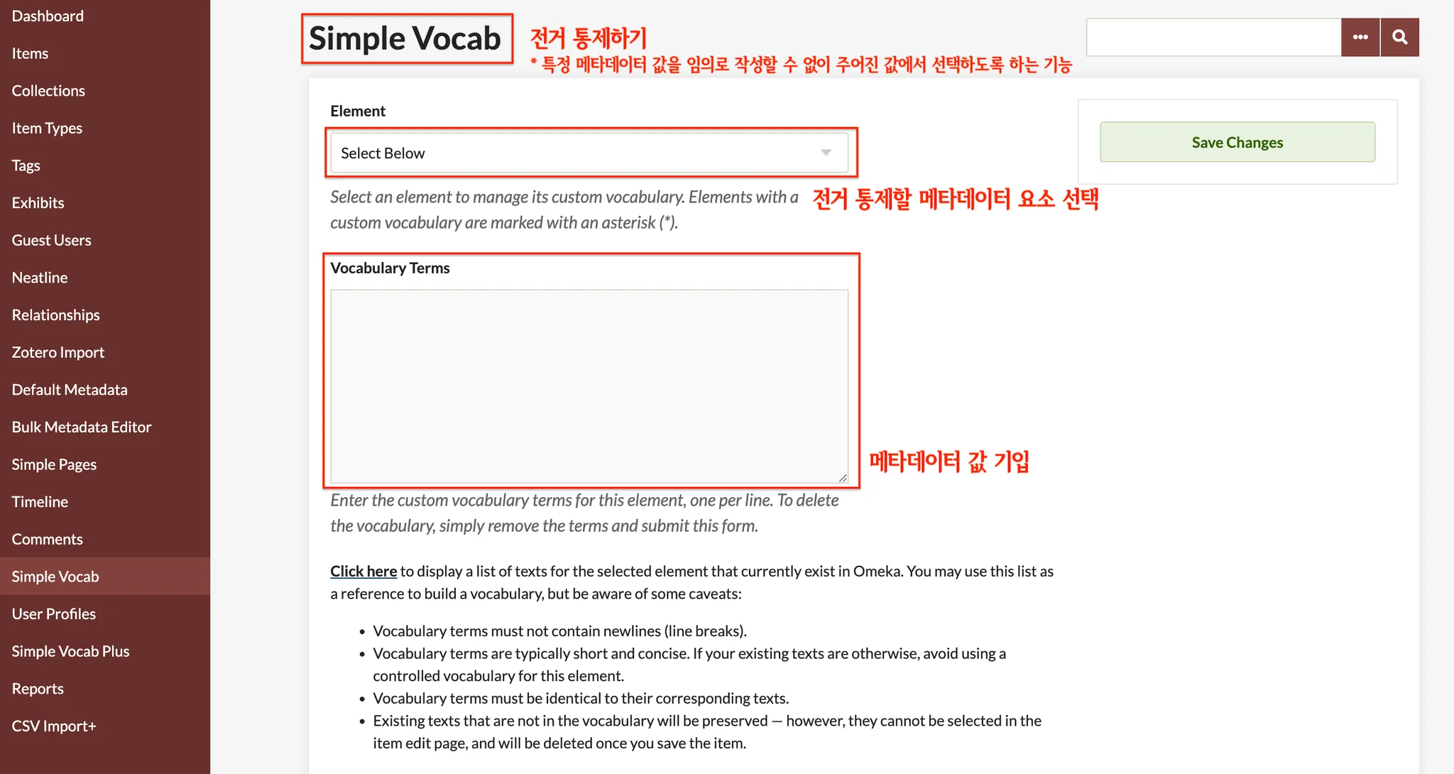 오메카 메타데이터 설정(Dublin Core Extended, Hide Elements, Simple Vocab 등)