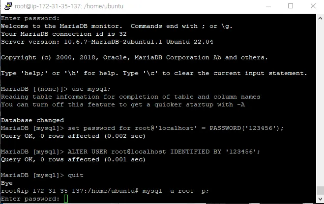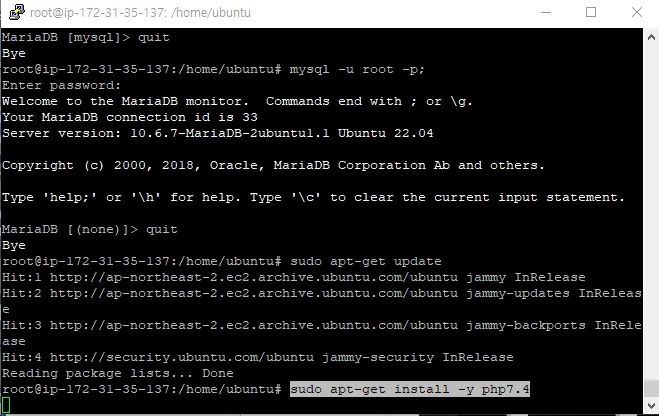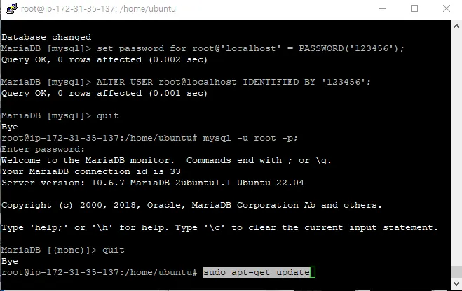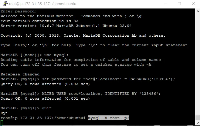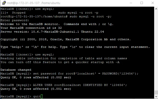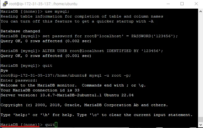 정상적으로 암호가 변경되었는지 확인하기 위해, quit 명령어로 마리아DB를 닫습니다.