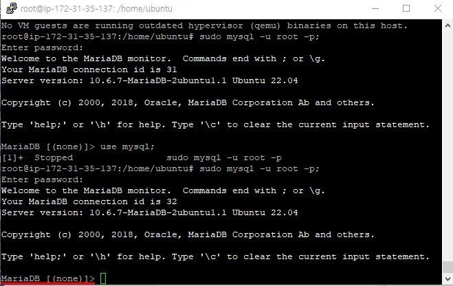 정상적으로 접속 되었다면 입력 항목이 위와 같이 “MariaDB [none]>”으로 전환됩니다.