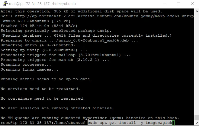 오메카 패키지 압축을 풀기 위한 Unzip을 설치합니다.