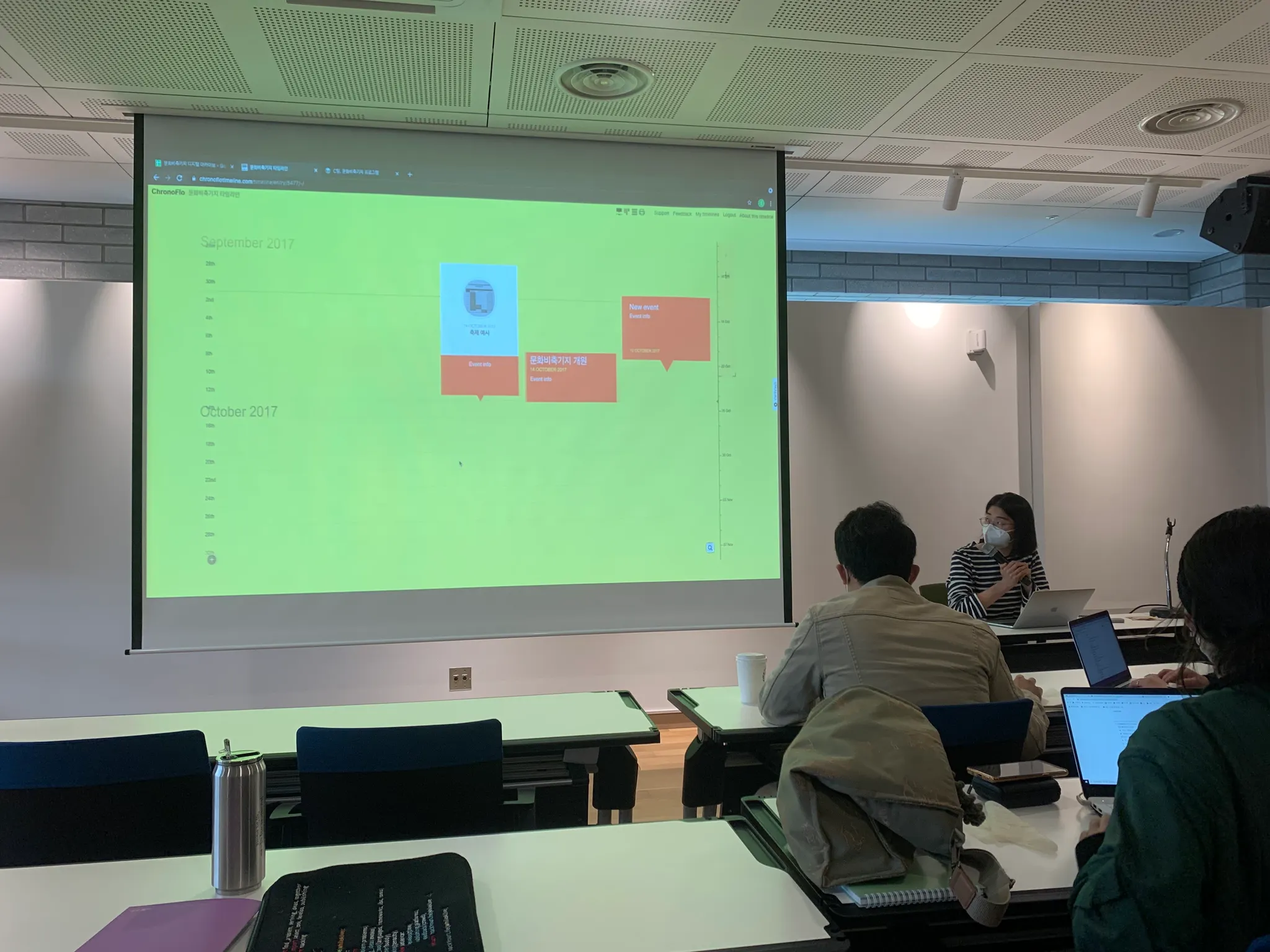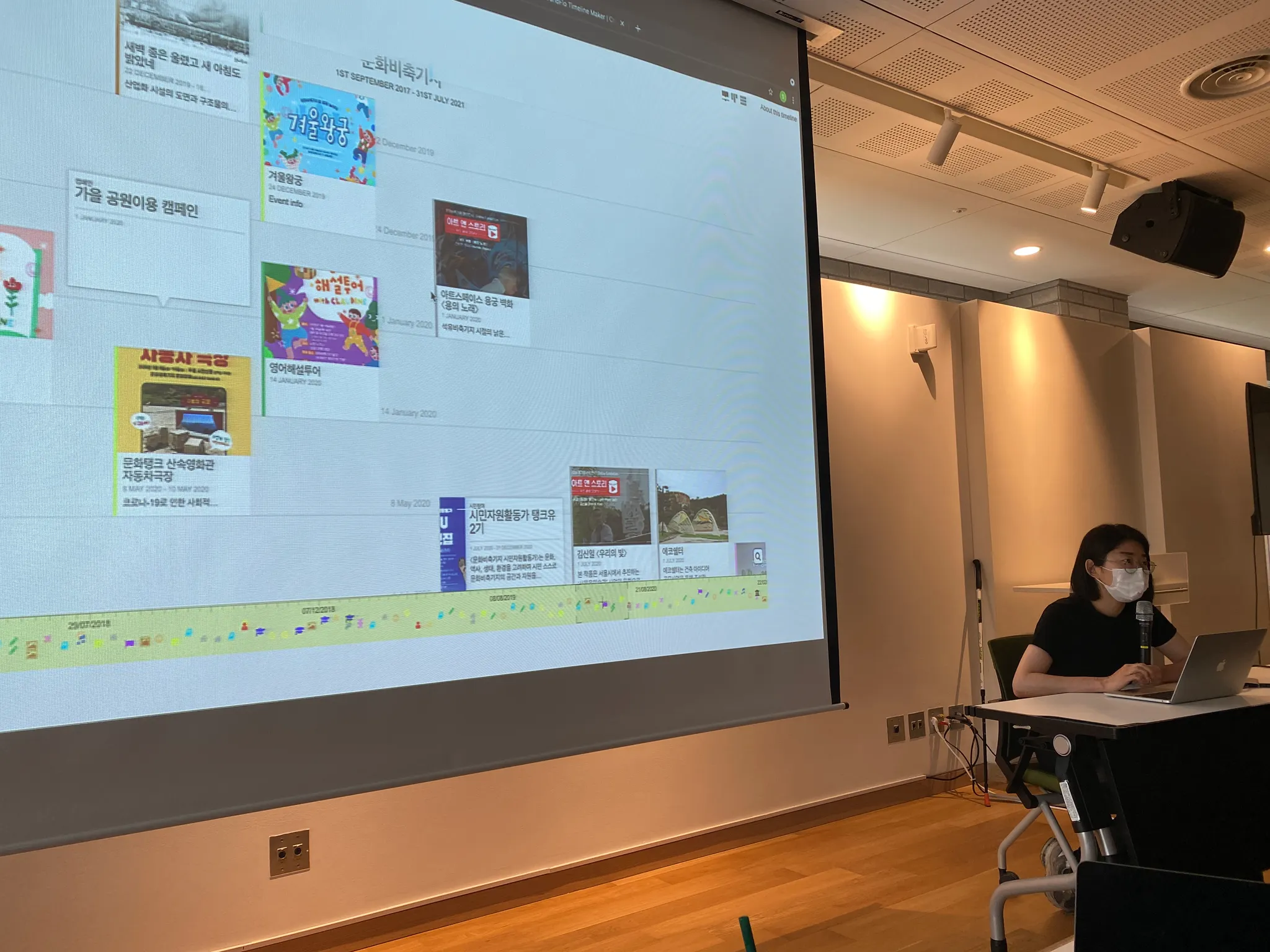 C팀 진행상황 발표 - 크로노포토라는 툴의 레이아웃이 예뻤습니다. 홍보팀에 새로운 담당자가 와도 이 타임라인을 보면 문화비축기지의 100개 넘는 사업들을 쉽게 이해하고 링크를 클릭해 첨부파일을 활용할 수 있게 되었습니다