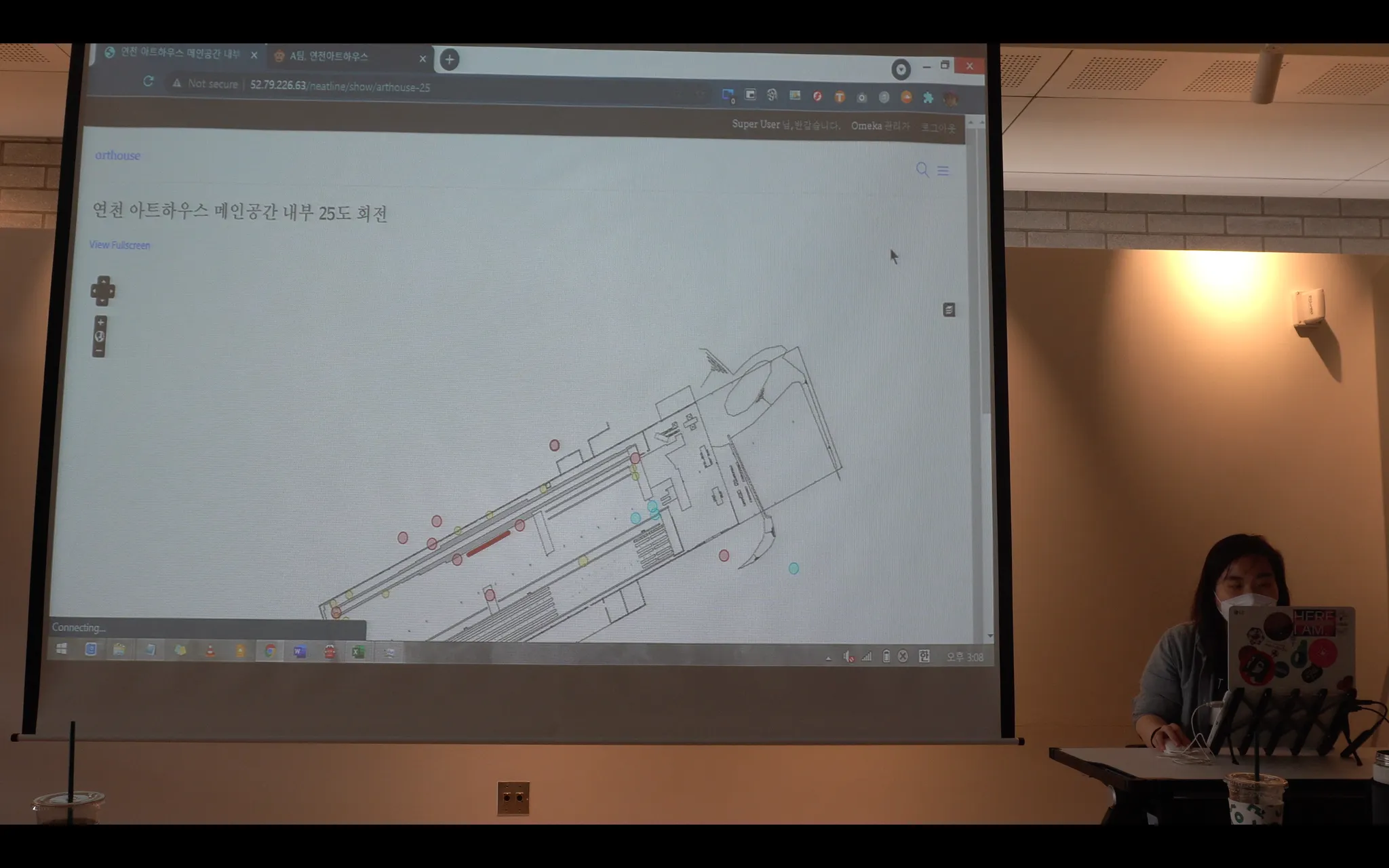 A팀. 오메카 니트라인을 이용해 옛 공장 지도 위에 사진을 매핑했습니다. 니트라인은 커스텀 지도를 매핑할 수 있는 장점이 있지만 모바일 접근성 단점도 있습니다