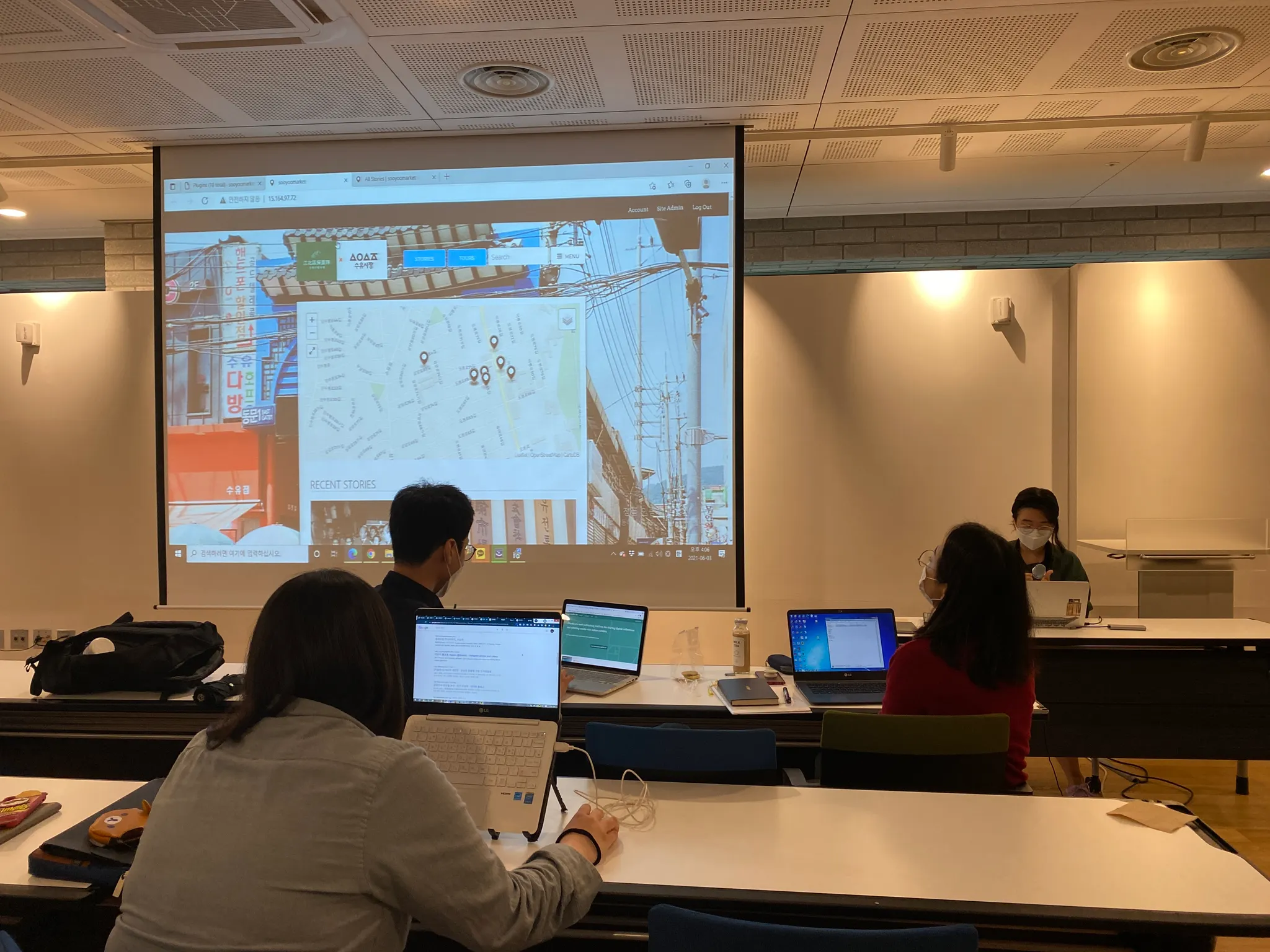D팀(수유동 재래시장)은 오늘 Curatescape를 설치했습니다. 아카이브랩 이승일 선생님(좌측 두번째)이 1시간만에 설치와 세팅을 끝내주셨습니다.