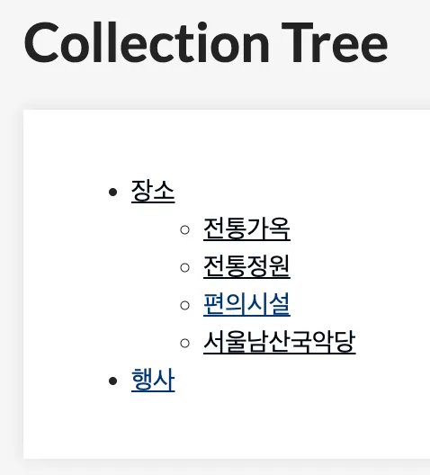 ‘전통가옥 ~ 서울남산국악당’ 컬렉션은 ‘행사’ 컬렉션과 구분되는 장소성을 갖고 있어 ‘장소’라는 상위 컬렉션 추가