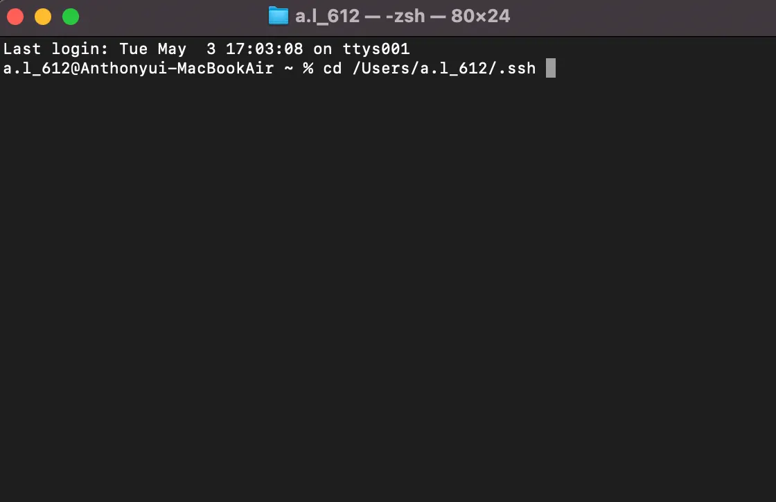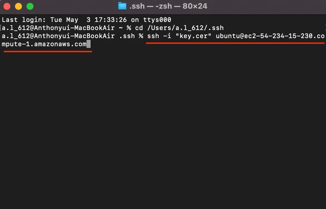 터미널을 열어 키 파일이 저장된 경로로 이동합니다. 저는 사용자 폴더 하위에 있는 “.ssh” 폴더에 저장해 두었으므로, 이 경로로 이동합니다!