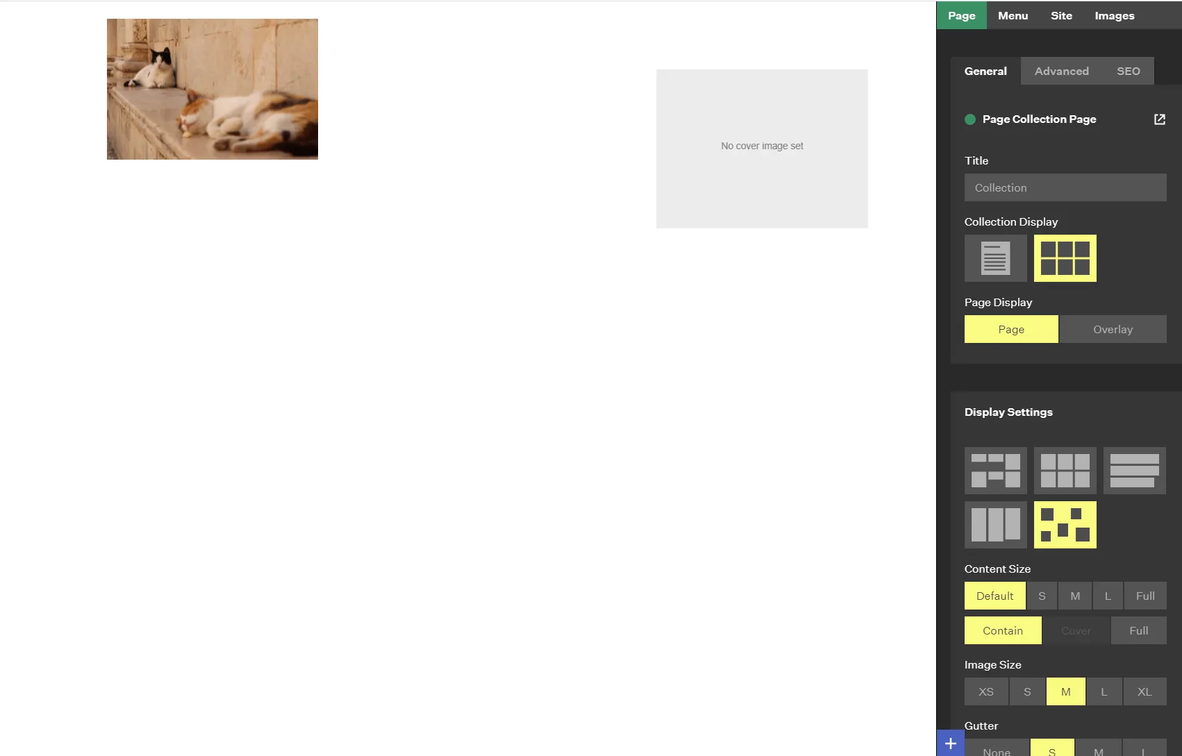 Site에서와 마찬가지로, Content Size를 통해 이미지 틀의 사이즈를 조정할 수 있으며, Default로 설정할 경우, Site 항목에서 설정한 기본값과 맞춰집니다.