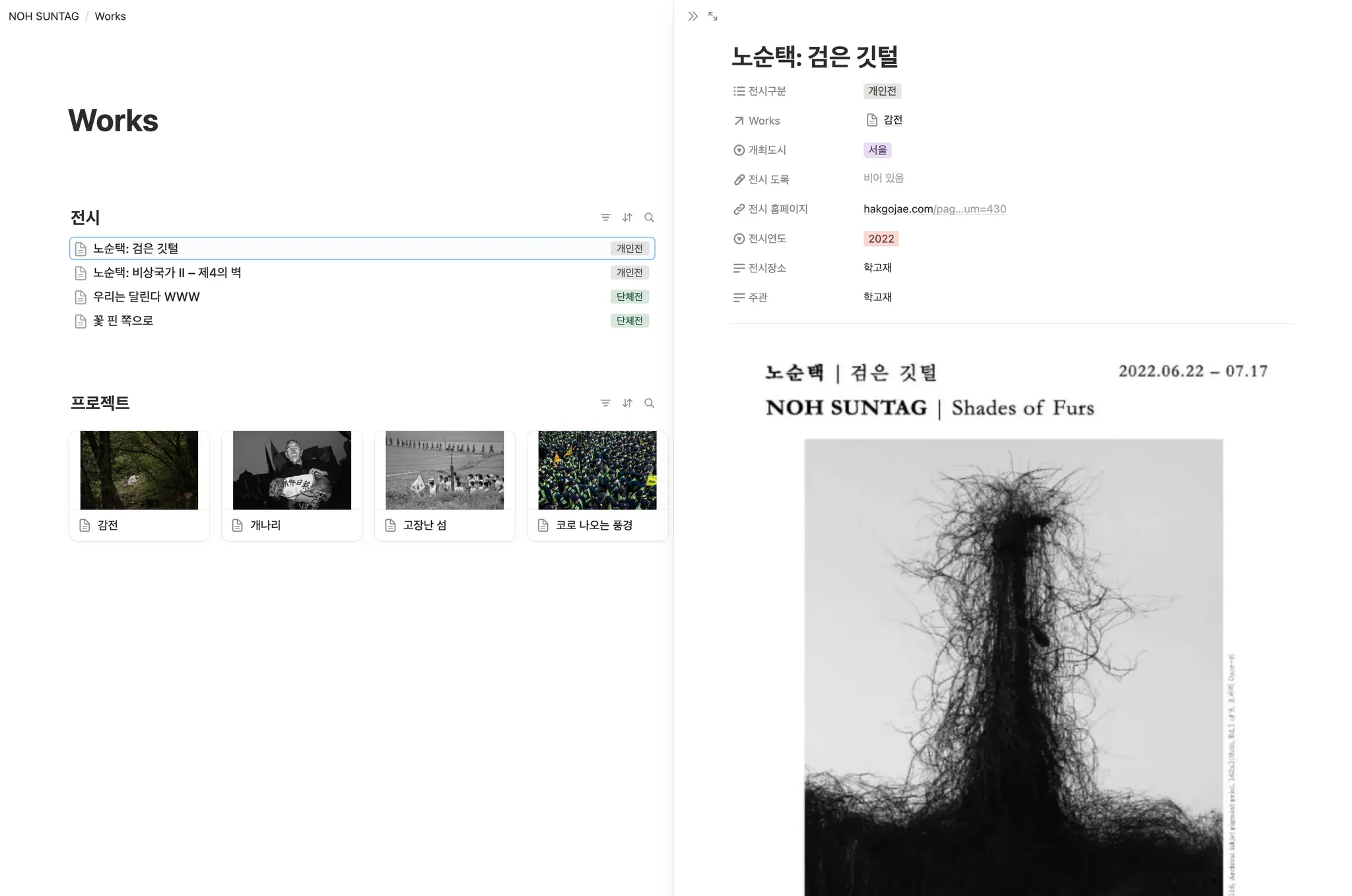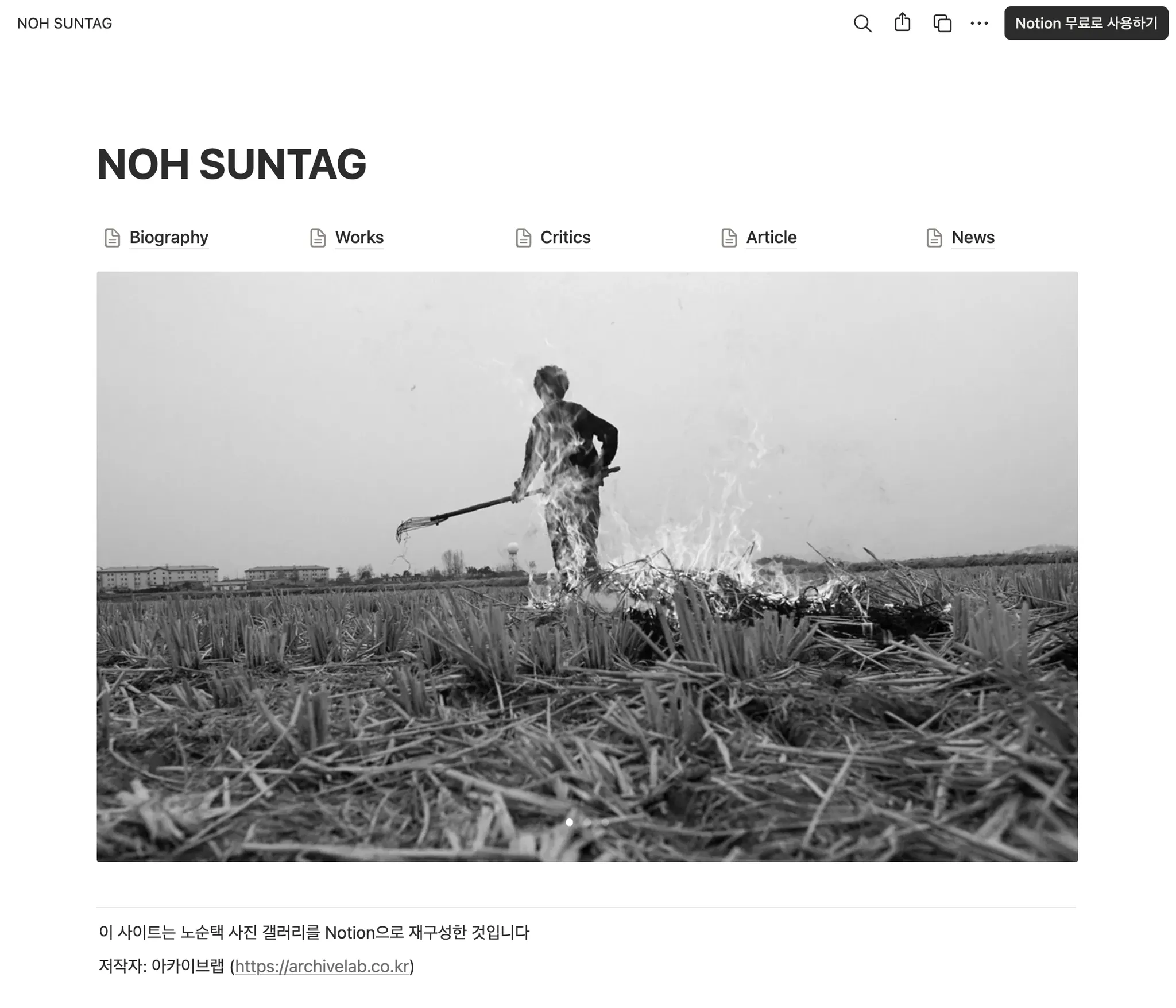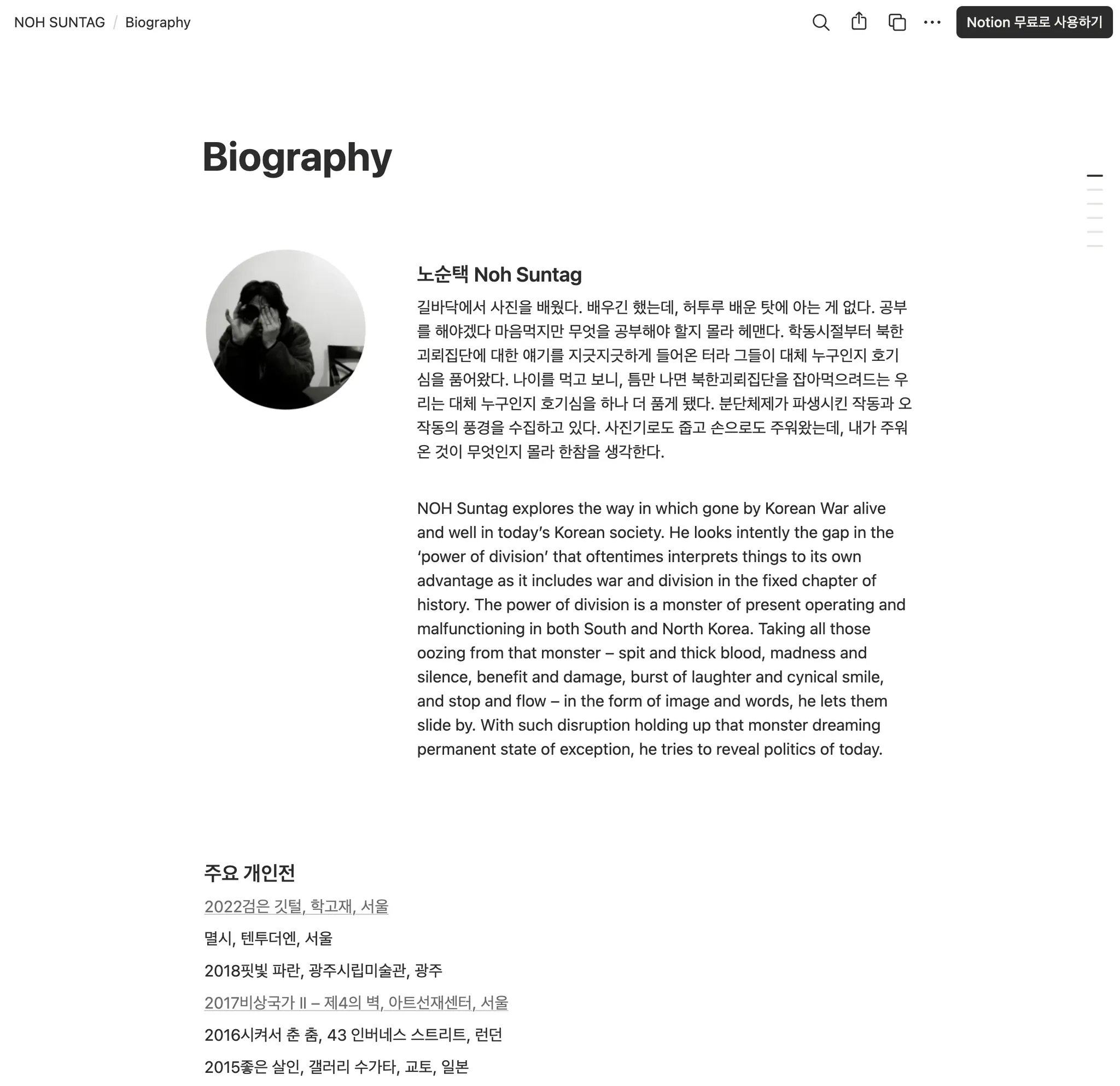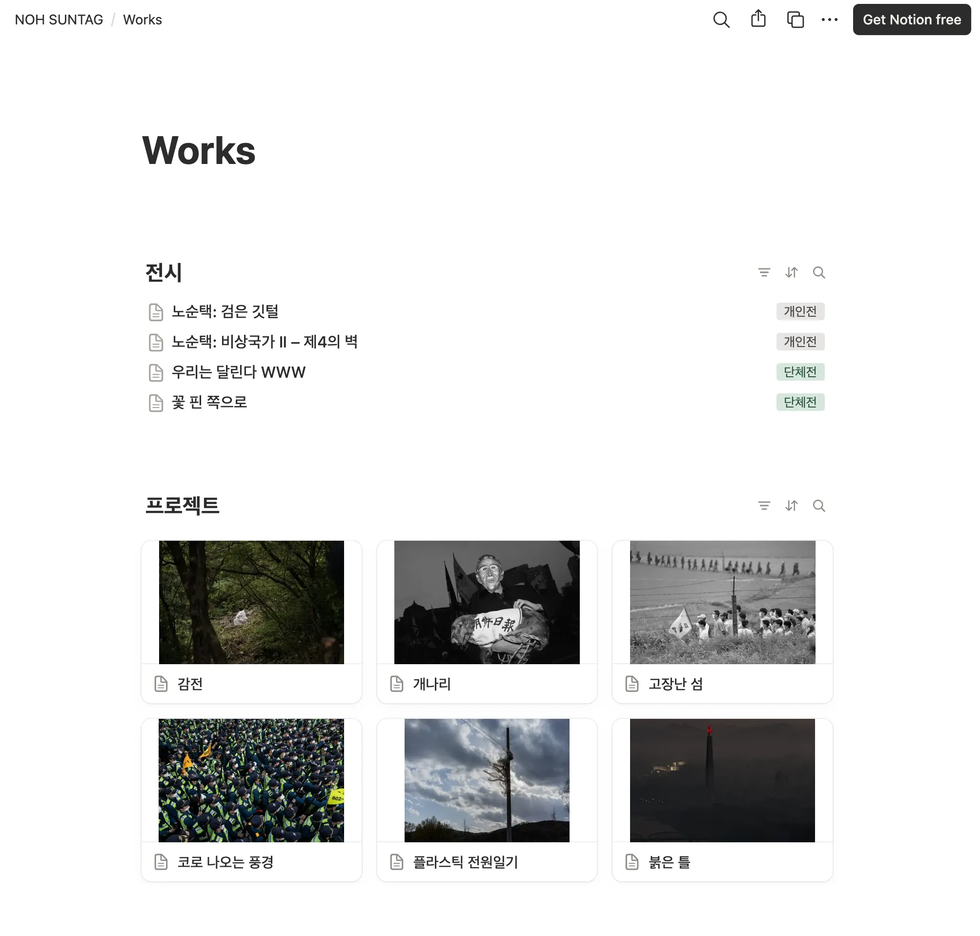 노순택 작가의 포트폴리오 사이트를 노션으로 옮겨 보겠습니다.