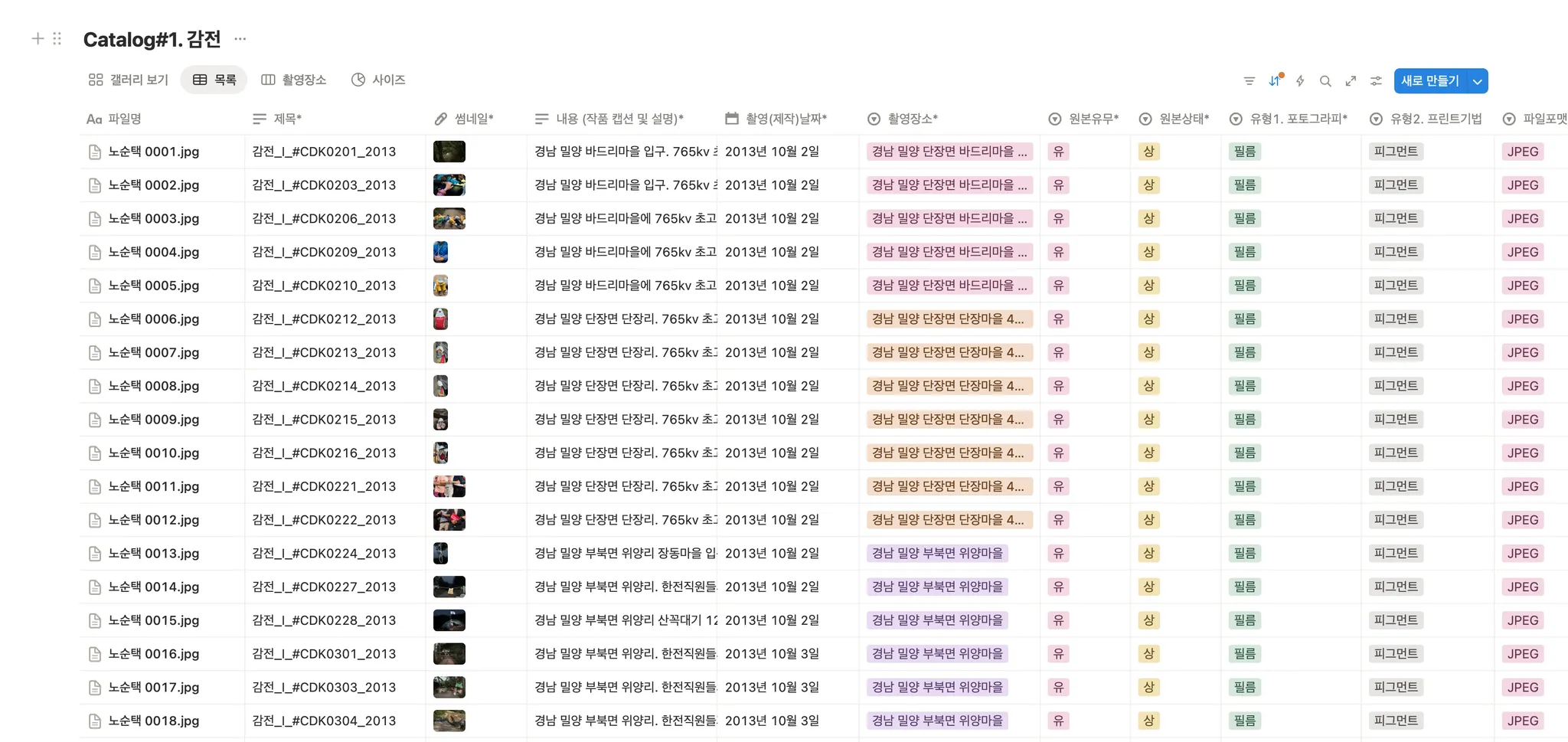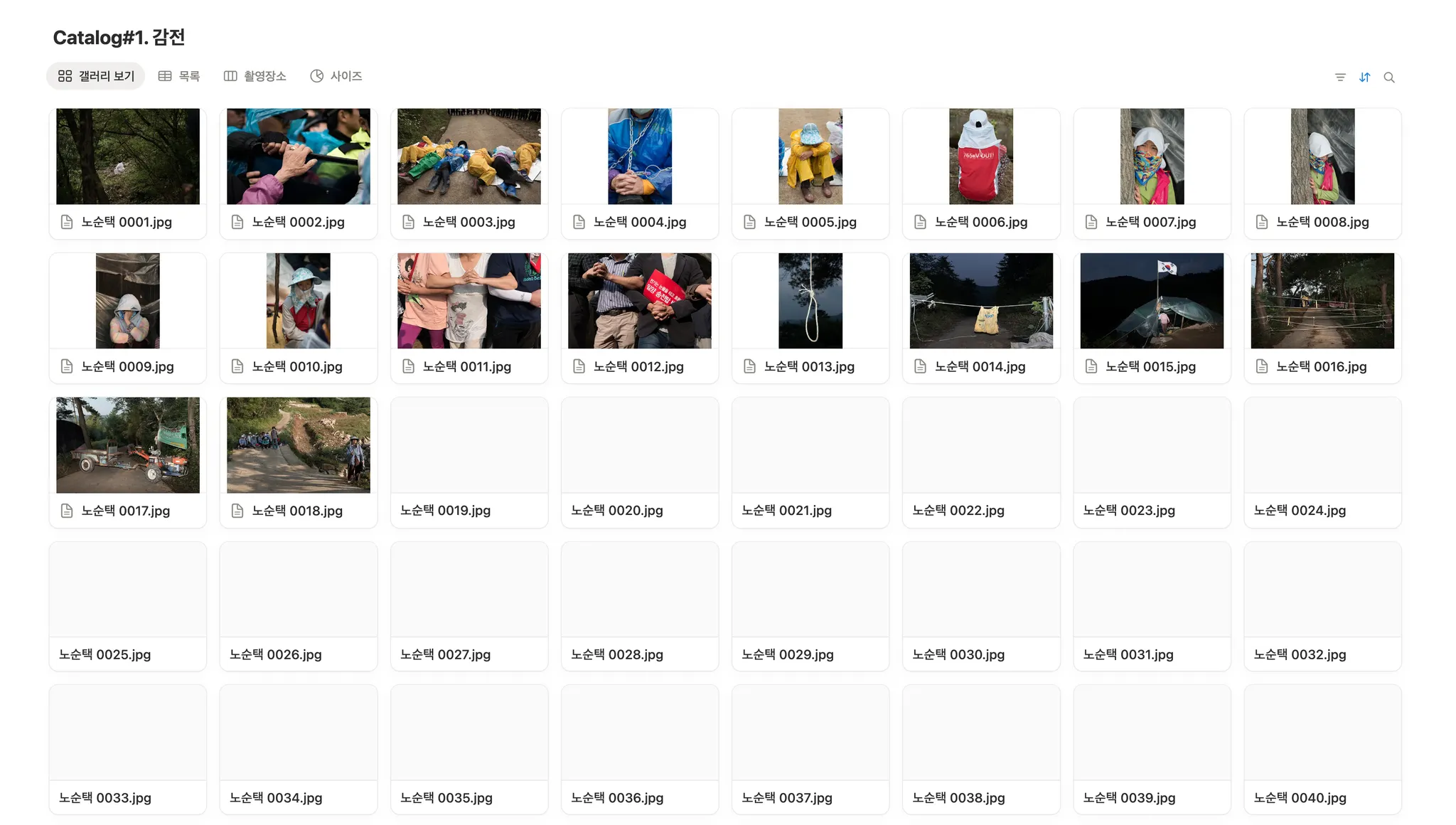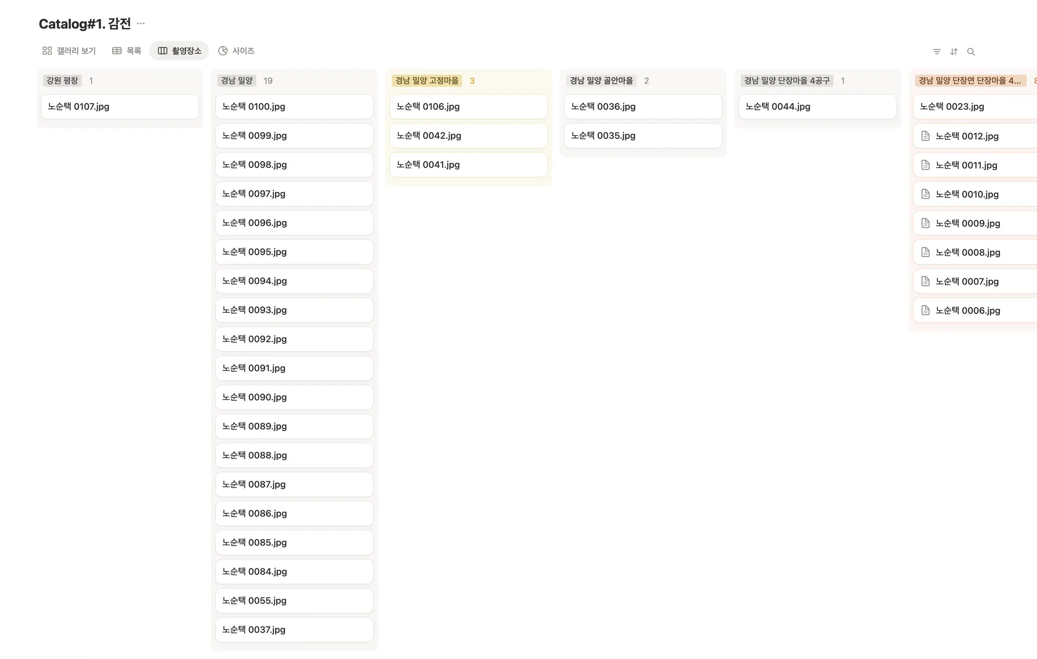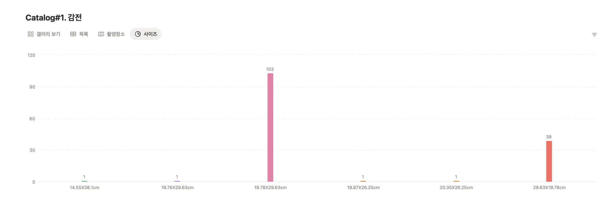 레이아웃: 갤러리 보기를 기본으로 설정. 표, 보드(촬영장소별 보기), 차트(사이즈별 보기) 등 다양한 보기 방식 구성