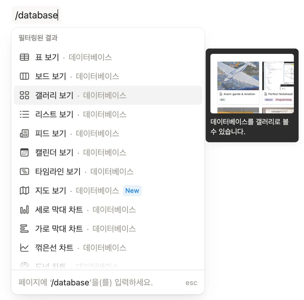 1. /database 슬래시 명령어 입력 > 갤러리 보기 선택