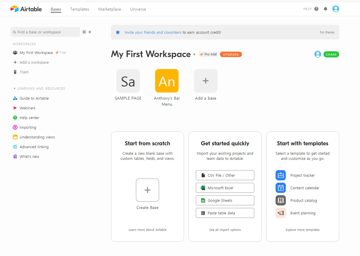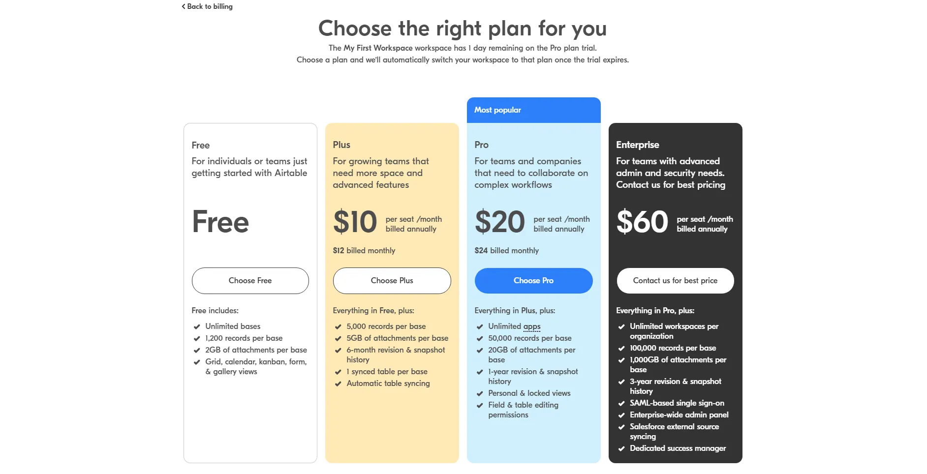 Airtable은 Pro plan을 기본기능으로 설정하고 있습니다. 회원가입 시 14일(2주)간 Pro plan을 체험할 수 있도록 제공하며, 이후 자동으로 Free plan으로 전환됩니다.