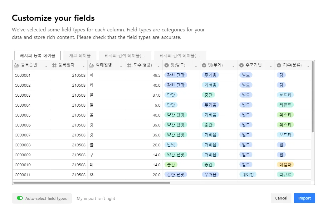 기존 데이터를 불러오는 경우, 항목의 유형을 분석하여 적절한 유형으로 자동매핑합니다.