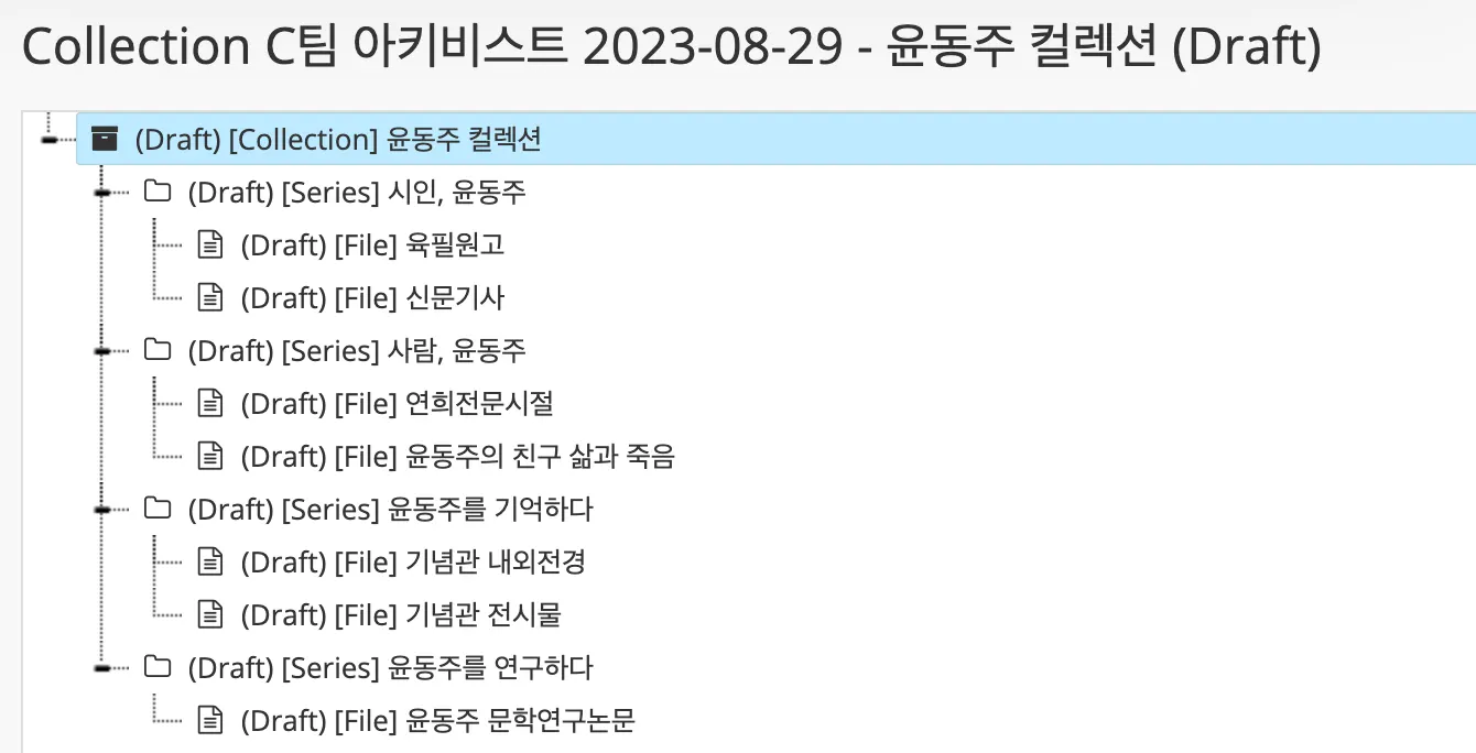 - 최초 시리즈 분류 아이디어(육필 원고/ 윤동주 사진 / 기념관 사진 / 관련 문헌, 자료)
