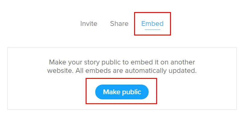 이제 완성한 스토리를 공유 또는 외부에 퍼블리싱할 차례다. 우측 상단 메뉴 중 [Share]를 선택하여 [Embed]를 클릭한다.