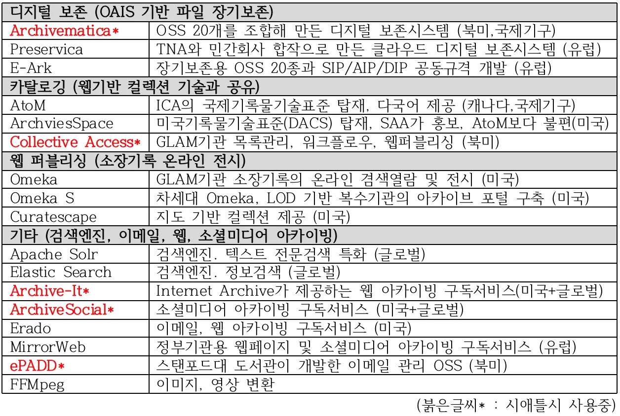 Q2. (해외솔루션 도입) 해외 솔루션이나 오픈소스 소프트웨어 도입장벽을 낮추는 방법은 무엇인가? 실제로 서울기록원은 Preservica와 Archive-It, 대통령기록관은 Archive-It 구독을 검토했으나 무산되었다. 웹과 이메일 아카이빙, OAIS를 충족하는 디지털 보존시스템, 온라인 카탈로깅 등은 해외 솔루션이나 전문 오픈소스를 도입하는 것이 효율적이다. 국내 수요가 적은 상태에서 경쟁력 있는 솔루션이 등장할 가능성은 앞으로도 매우 낮다.