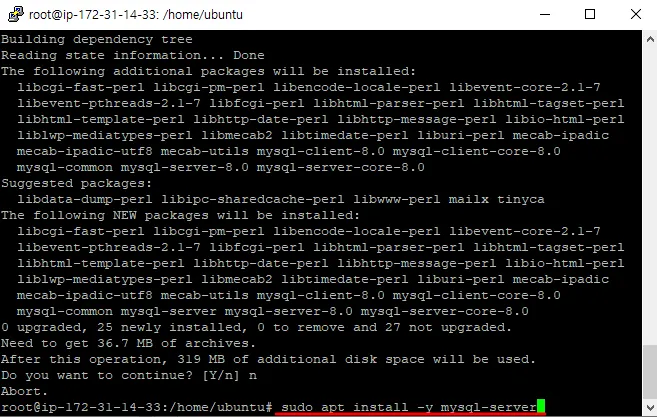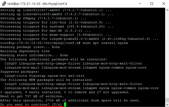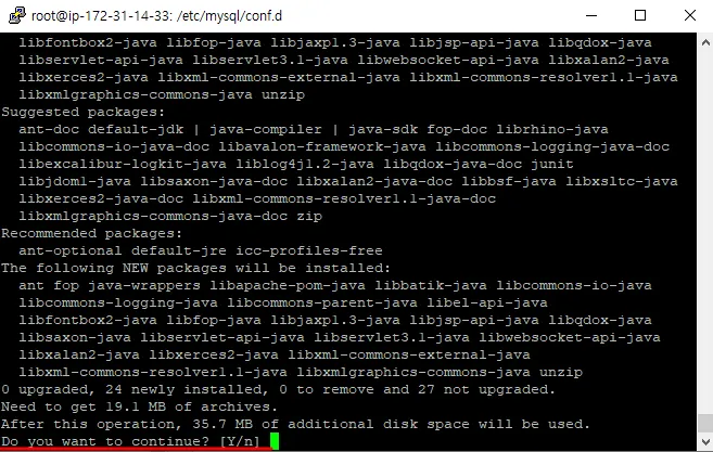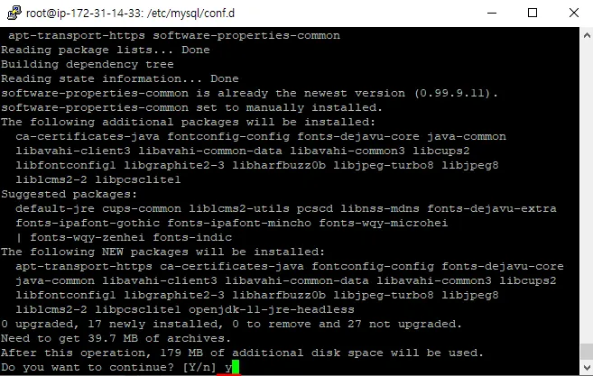 설치 중간에 입력항목이 나오면 y를 입력해서 설치를 계속해줍니다.