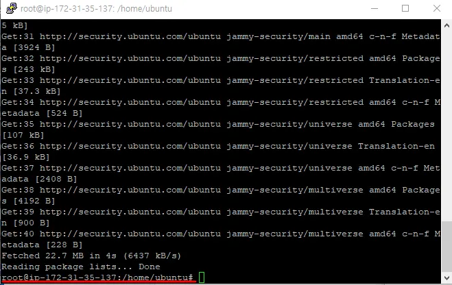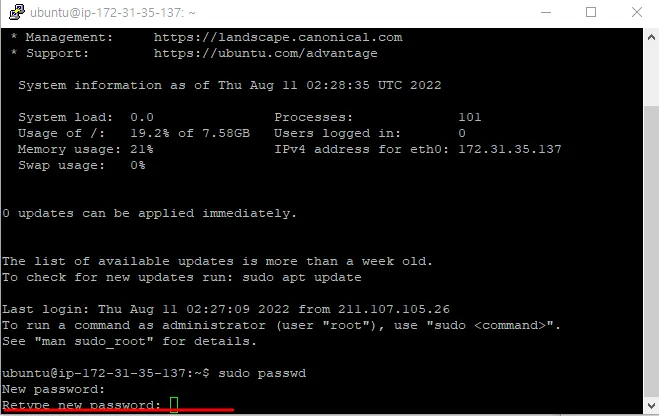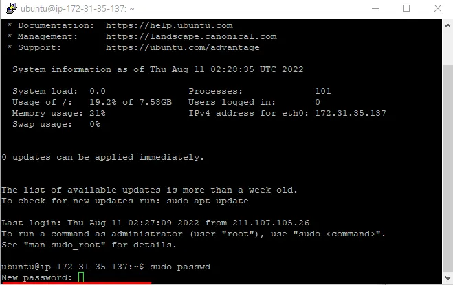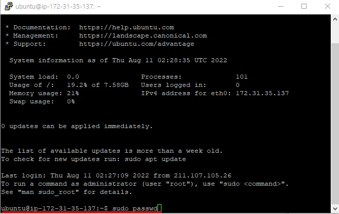 PuTTY, 터미널 혹은 AWS의 ‘연결’ 로 우분투에 접속한 시점에서 시작합니다. 이미지는 PuTTY이지만, 터미널 역시 같은 구조이므로 똑같이 따라오시면 됩니다.
