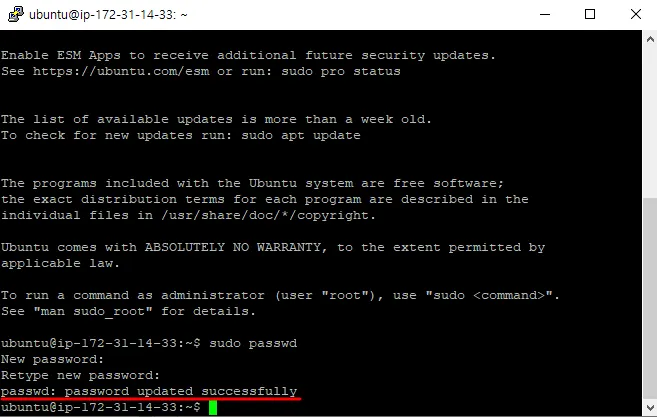 패스워드를 성공적으로 생성했다면, 위와 같은 메시지가 출력됩니다. 만약 위의 “successfully” 멘트가 나오지 않고 오류가 발생한다면 두 번의 패스워드를 다르게 입력되었을 가능성이 큽니다. 위의 과정을 다시 반복합니다.