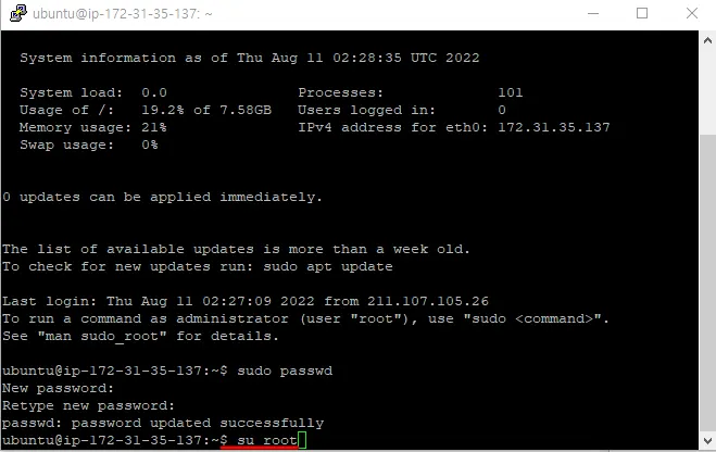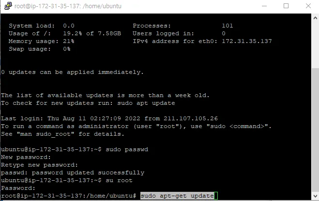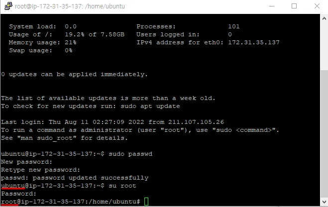 패스워드는 역시 입력되는 내용이 보이지 않습니다. 당황하지 마시고 입력하신 후 엔터로 접속해 주세요! 정상적으로 접근 되었다면 입력 항목의 맨 앞 부분이 ubuntu에서 root로 전환됩니다.