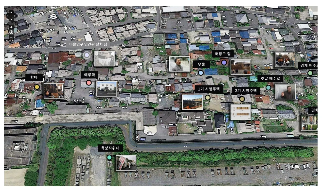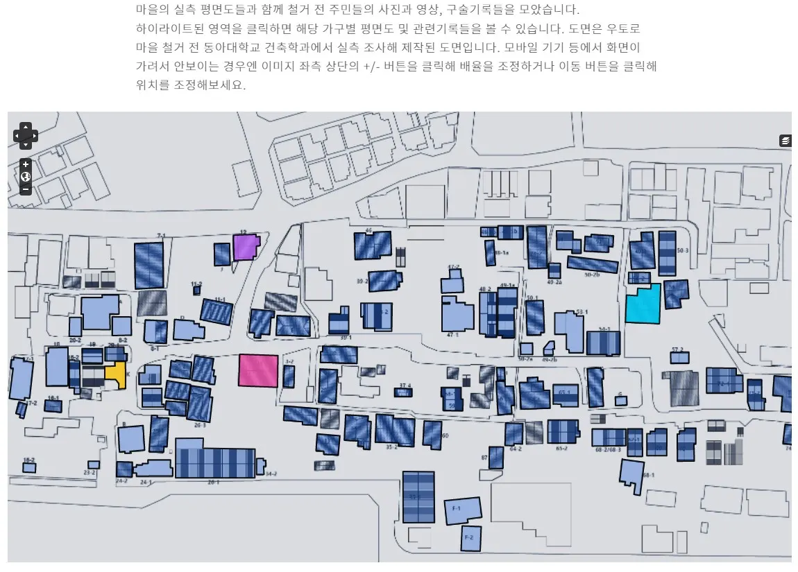 -가구별/거점별 기록보기: 마을 철거 전 찍은 사진과 영상, 도면 등 관련 기록물을 통해 디지털 마을 지도 구성