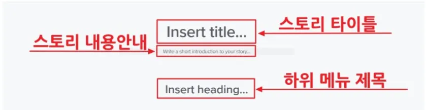 스토리 타이틀을 입력한다. 스토리 타이틀은 폰트, 사이즈가 지정되어 있어 입력만 한다. 타이틀 아래 스토리 내용안내는 폰트를 지정할 수 있다. 굵게하기, 이탤릭체, 정렬하기 등의 기본적인 폰트 설정 메뉴를 이용하면 된다.