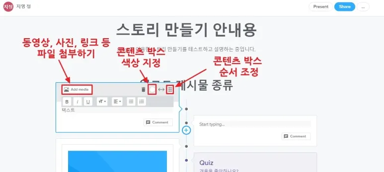 스토리 만들기 화면 상단에 [Present]를 클릭하면 프리젠테이션 화면이 나온다.