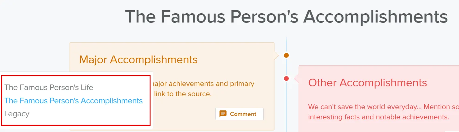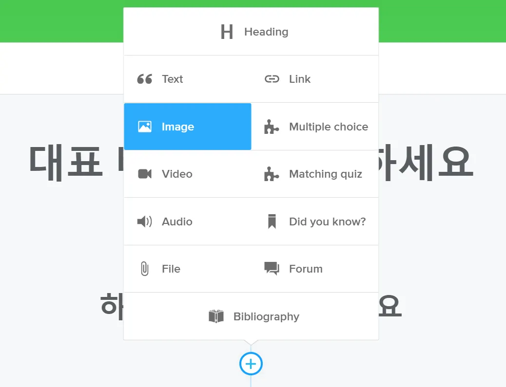 타임라인 사이 사이에 소제목을 추가하여 콘텐츠를 분류할 수 있다. 콘텐츠 추가 메뉴 가장 상단에 있는 [Heading]을 선택하여 소제목을 추가한다. 소제목에 따라 콘텐츠를 다시 분류할 수 있다.