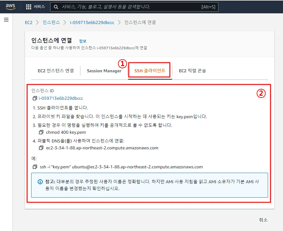 ssh -i "key.pem" ubuntu@ec2-(퍼블릭IP).ap-northeast-2.compute.amazonaws.com