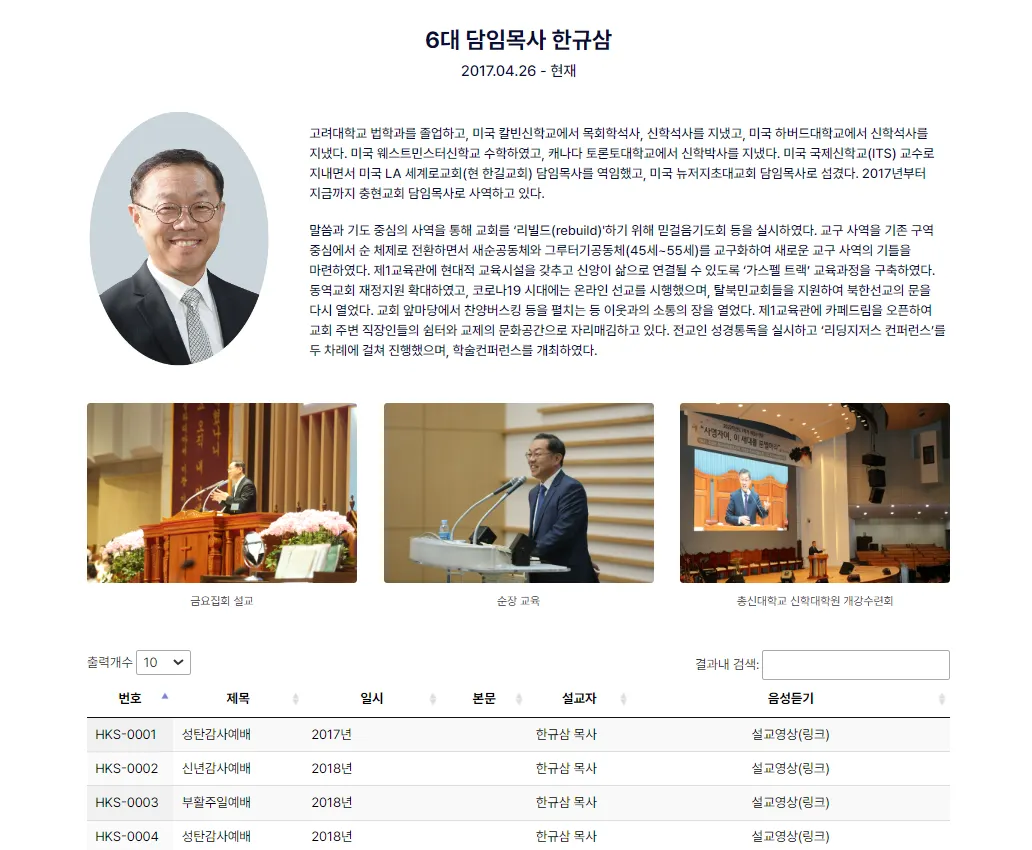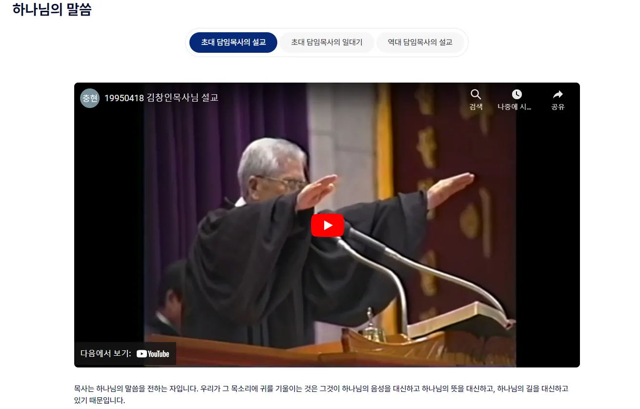 충현교회 초대 담임목사인 김창인 목사를 비롯하여 역대 담임목사들이 선포한 하나님의 말씀을 모아 구성한 기록콘텐츠입니다. 여기에서는 충현교회와 함께한 역대 담임목사들의 설교음성 및 설교영상을 살펴볼 수 있습니다.