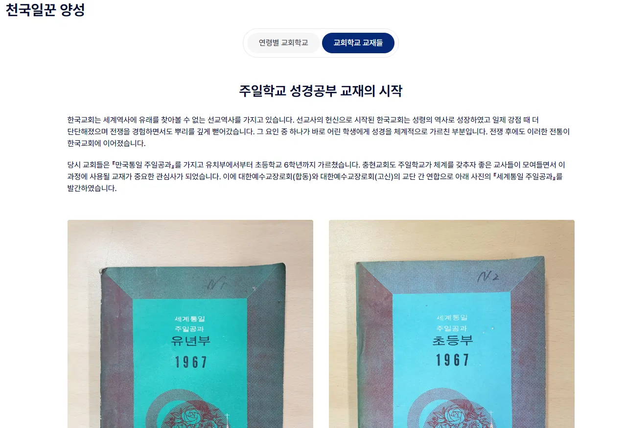 충현교회가 설립 초기부터 지금까지 변함없이 힘써온 목표는 '천국일꾼 양성'입니다. 그중에서도 연령별로 구성된 교회학교와 그곳에서 사용된 교재 등 천국일꾼 양성에 대한 대표적인 기록들을 이곳에 모았습니다.