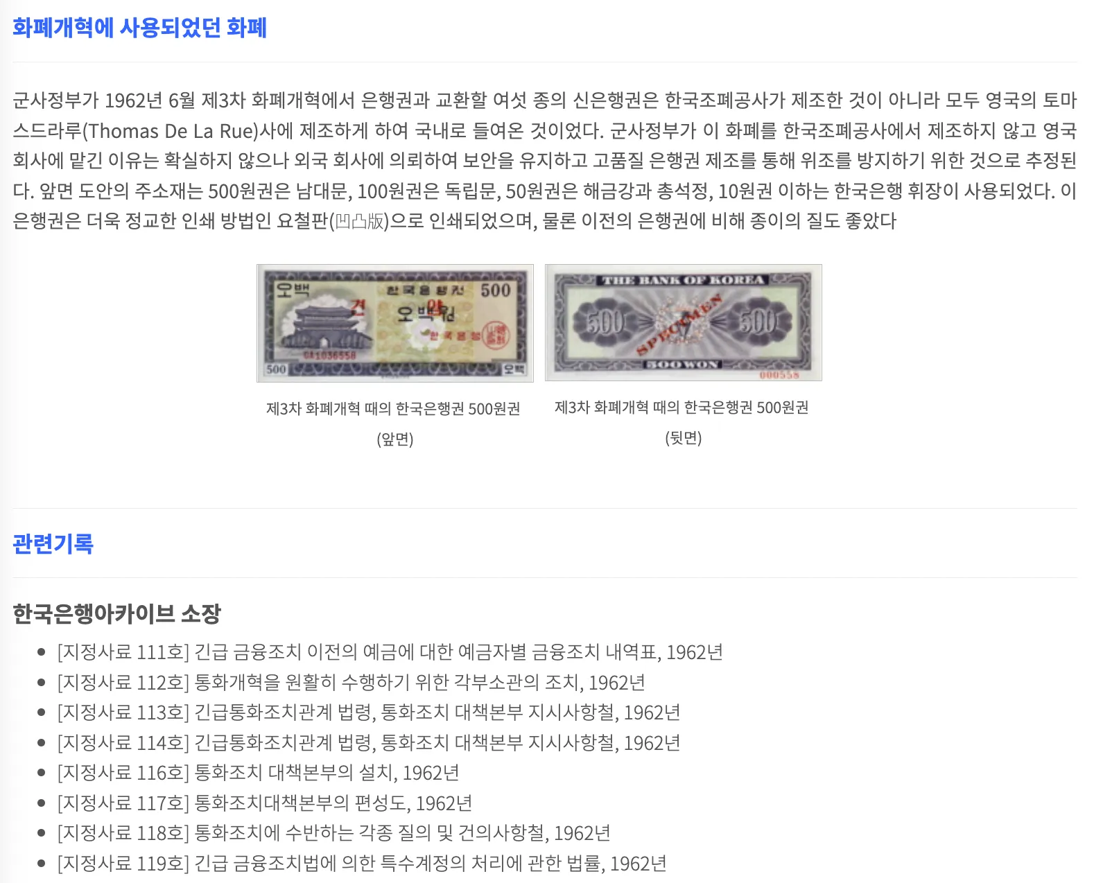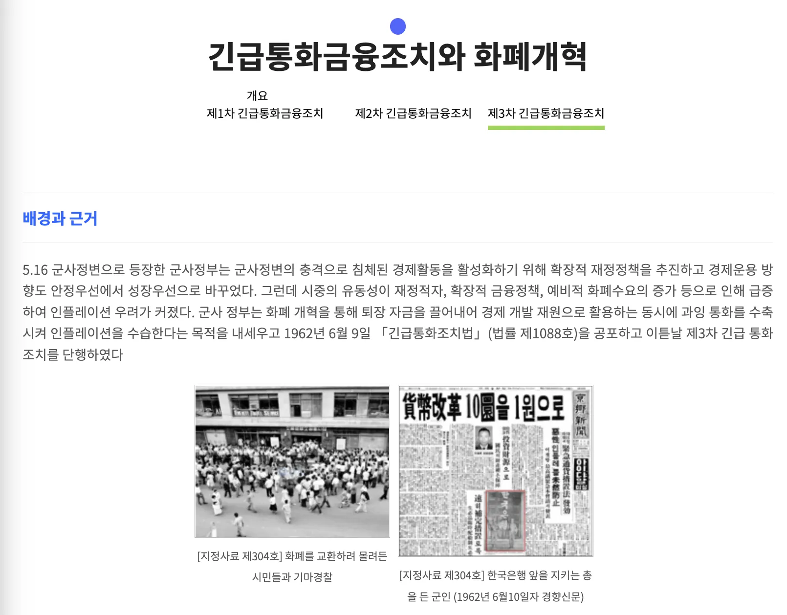 제1차부터 제3차까지 시행된 긴급통화금융조치와 화폐개혁의 배경과 근거, 주요 내용을 관련 기록과 연계하여 제공하는 콘텐츠