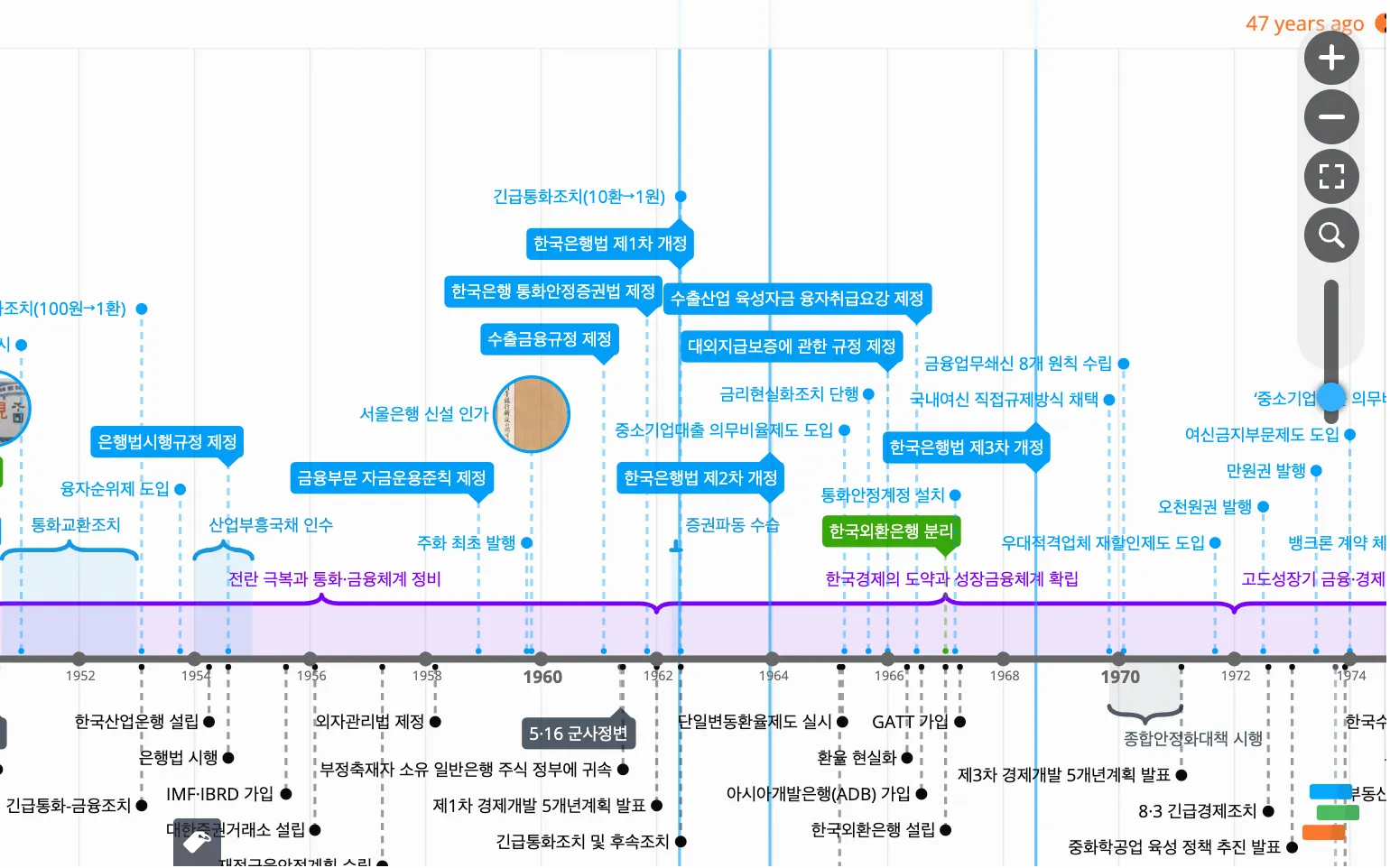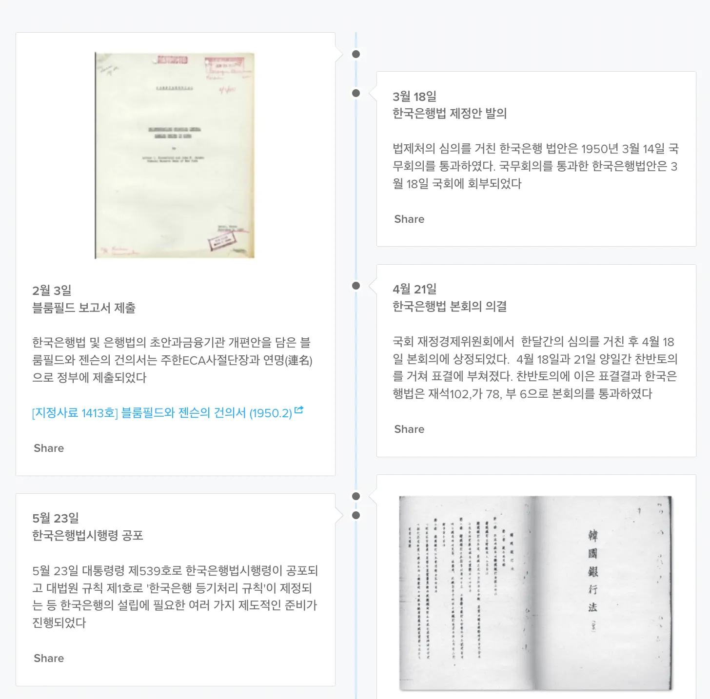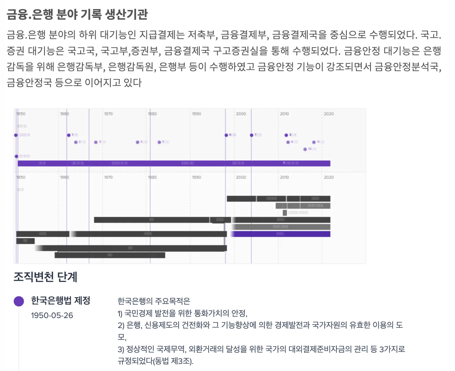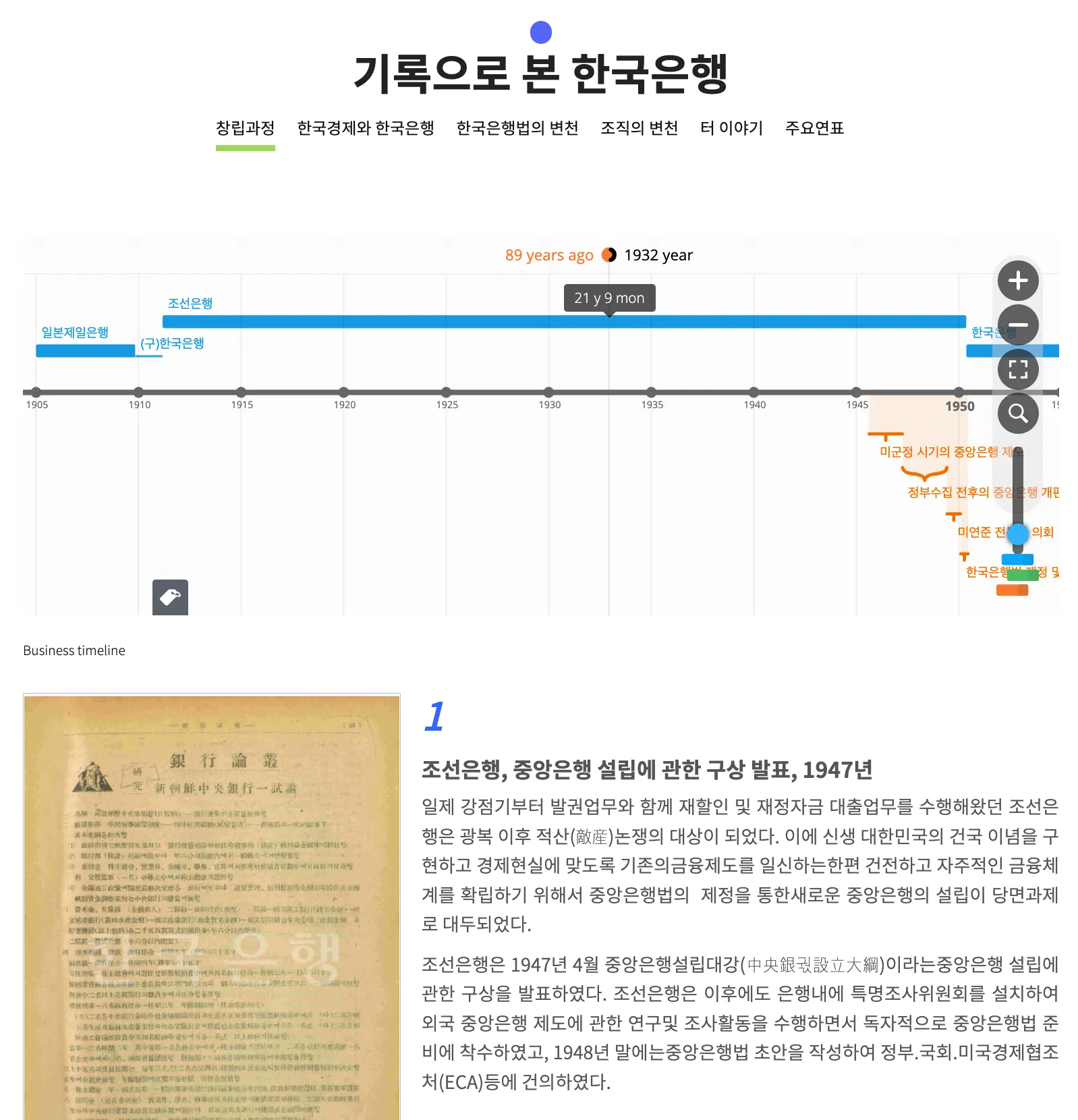한국은행의 창립과정, 한국은행법과 조직의 변천, 주요연표 등 한국은행의 변천사 전반을 기록을 통해 보여주는 콘텐츠
