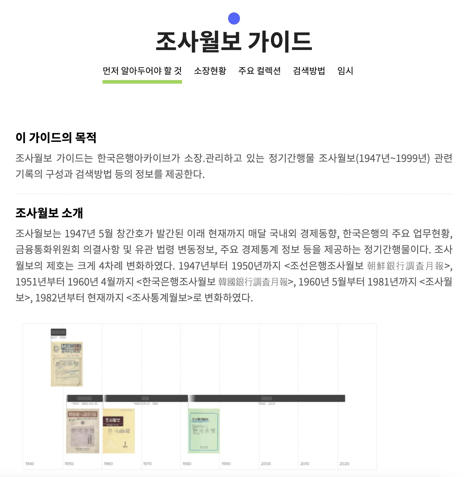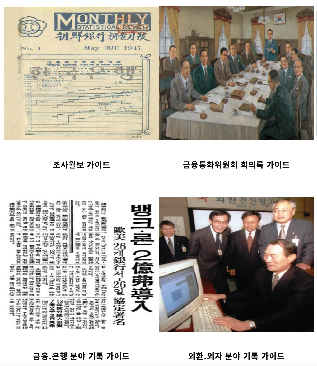 한국은행 아카이브가 소장.관리하고 있는 주제별(조사월보, 금융통화위원회 회의록 등) 관련 기록의 구성과 검색방법 등의 정보를 제공