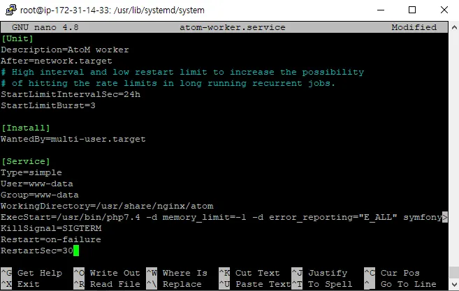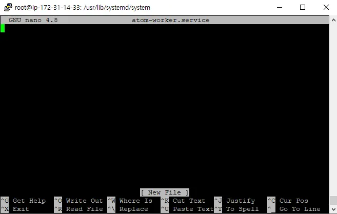 위와 같이 경로가 변경되었는지 확인합니다. 제대로 변경되었다면 nano 에디터로 서비스 파일을 생성하고 열어줍니다.