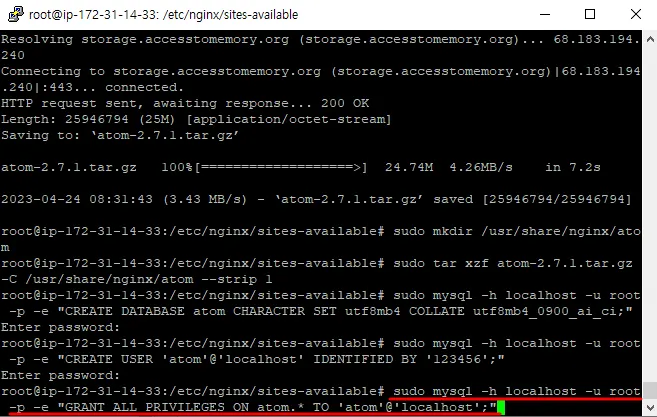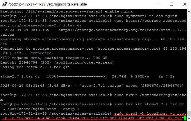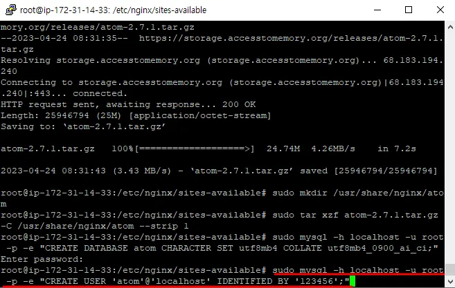 sudo mysql -h localhost -u root -p -e "CREATE DATABASE atom CHARACTER SET utf8mb4 COLLATE utf8mb4_0900_ai_ci;"