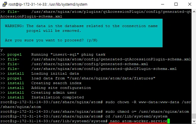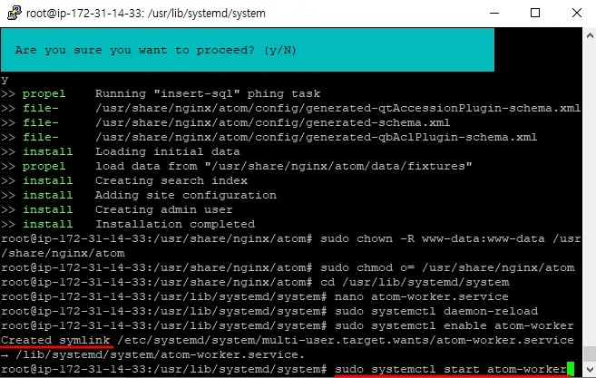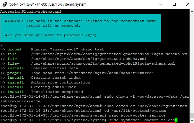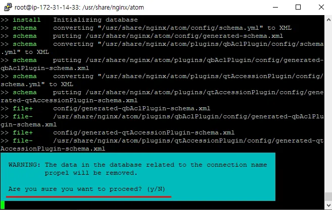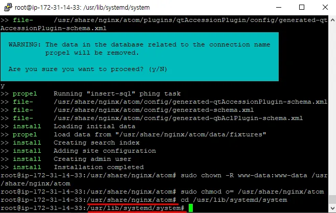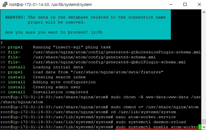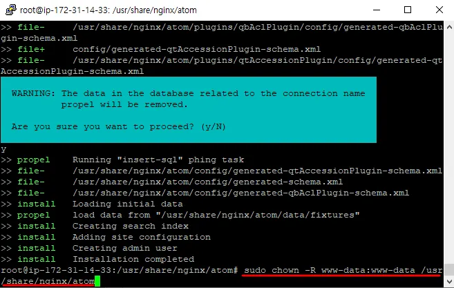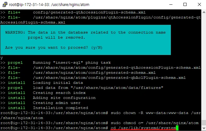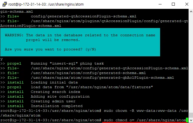 AtoM 설치가 끝났다면, 다음으로 서버를 설정합니다. 먼저 파일 시스템 권한을 설정합니다.