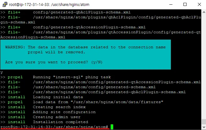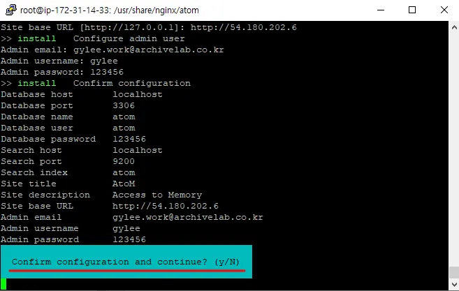 입력이 정상적으로 완료된 경우, 위와 같이 파란 박스로 계속 하겠는지 묻는 항목이 출력됩니다. y를 입력하여 계속합니다.