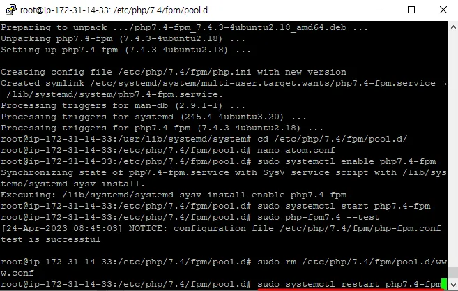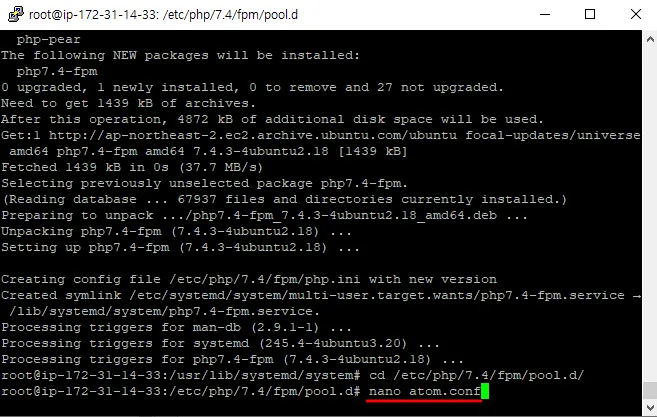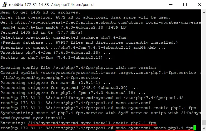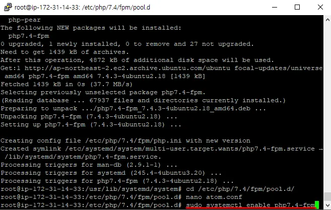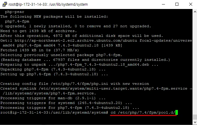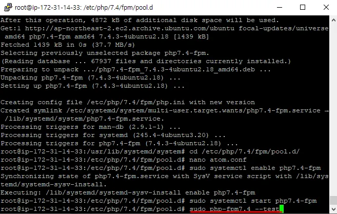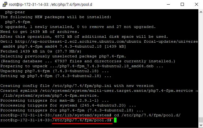 마지막으로 PHP-FPM을 사용하기 위해 PHP 환경설정을 수행합니다. 우선 php7.4-fpm을 설치합니다.