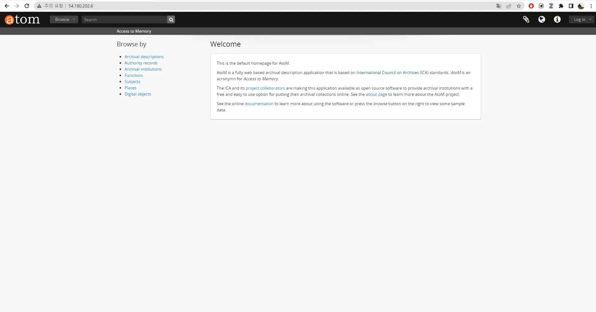 여기까지 수행하면 AtoM의 모든 설치과정이 끝났습니다. AtoM이 설치된 주소로 접속하면 설치가 된 것을 확인할 수 있습니다.