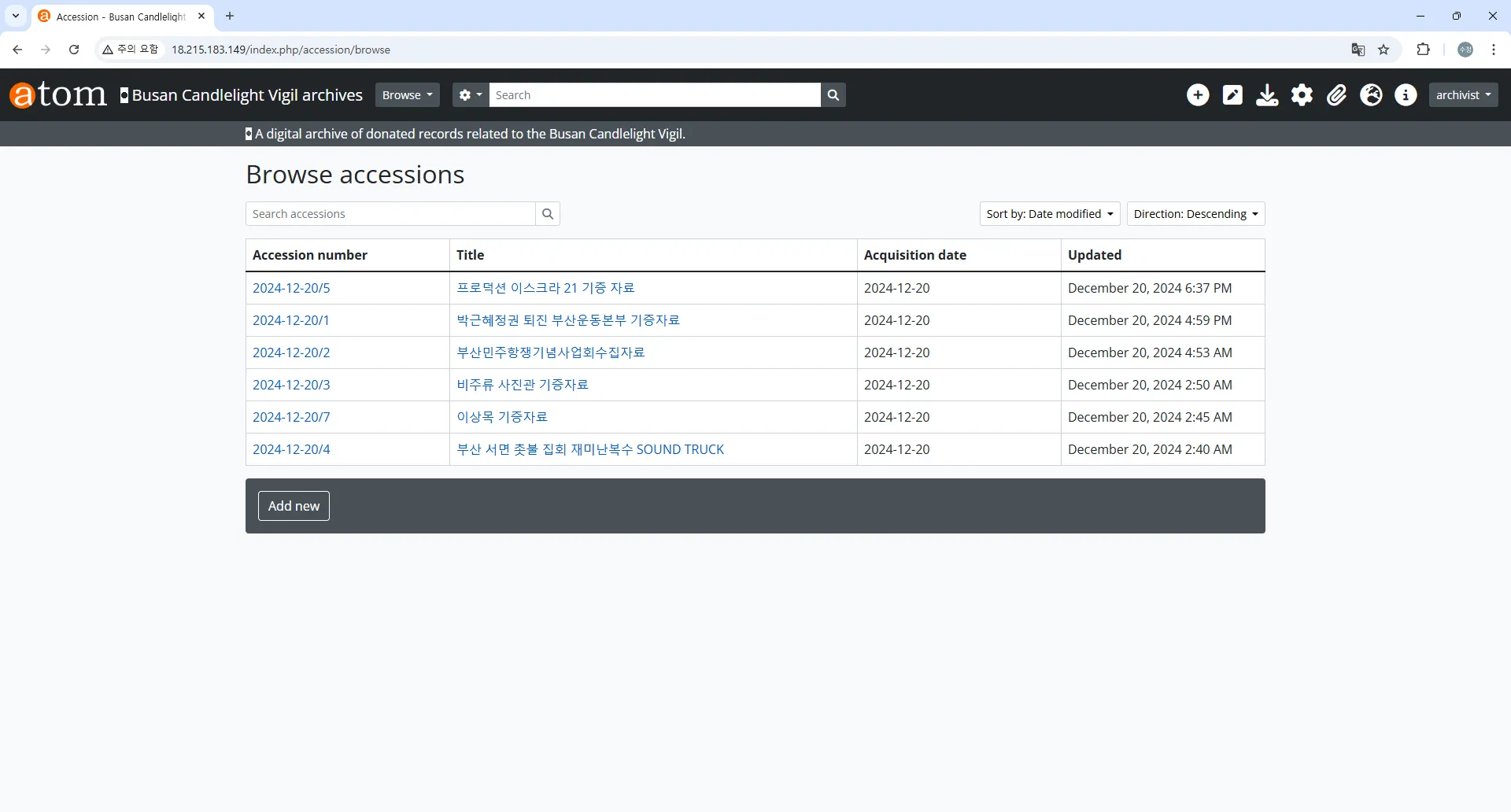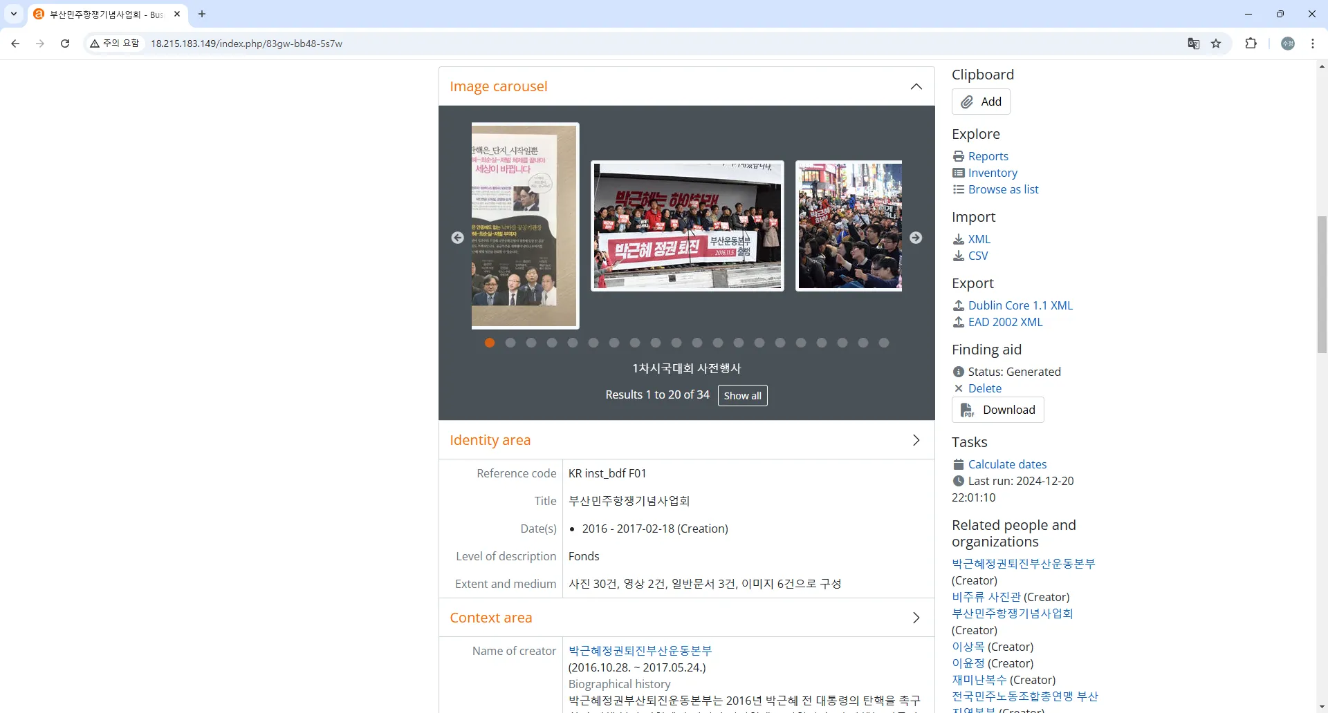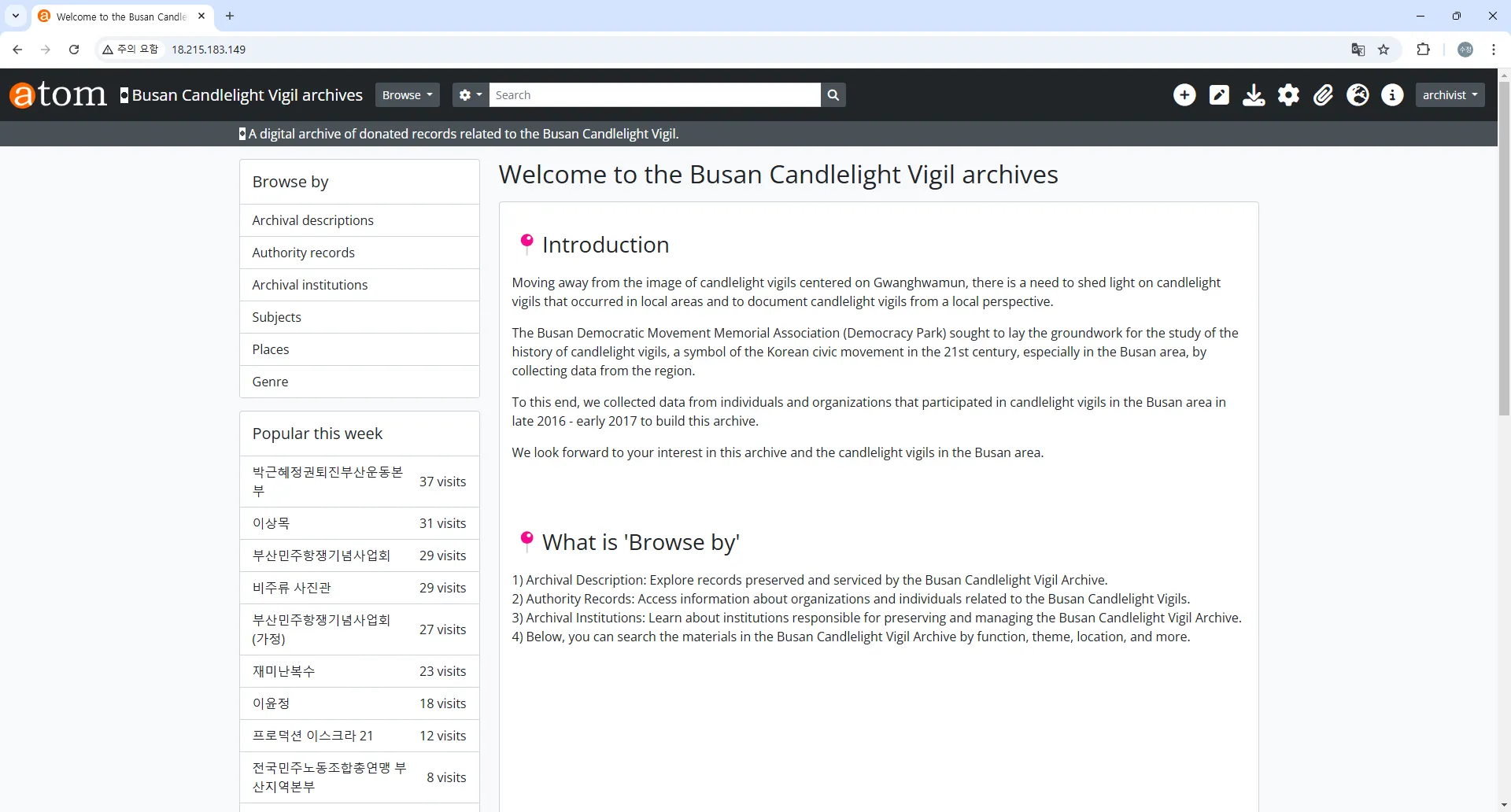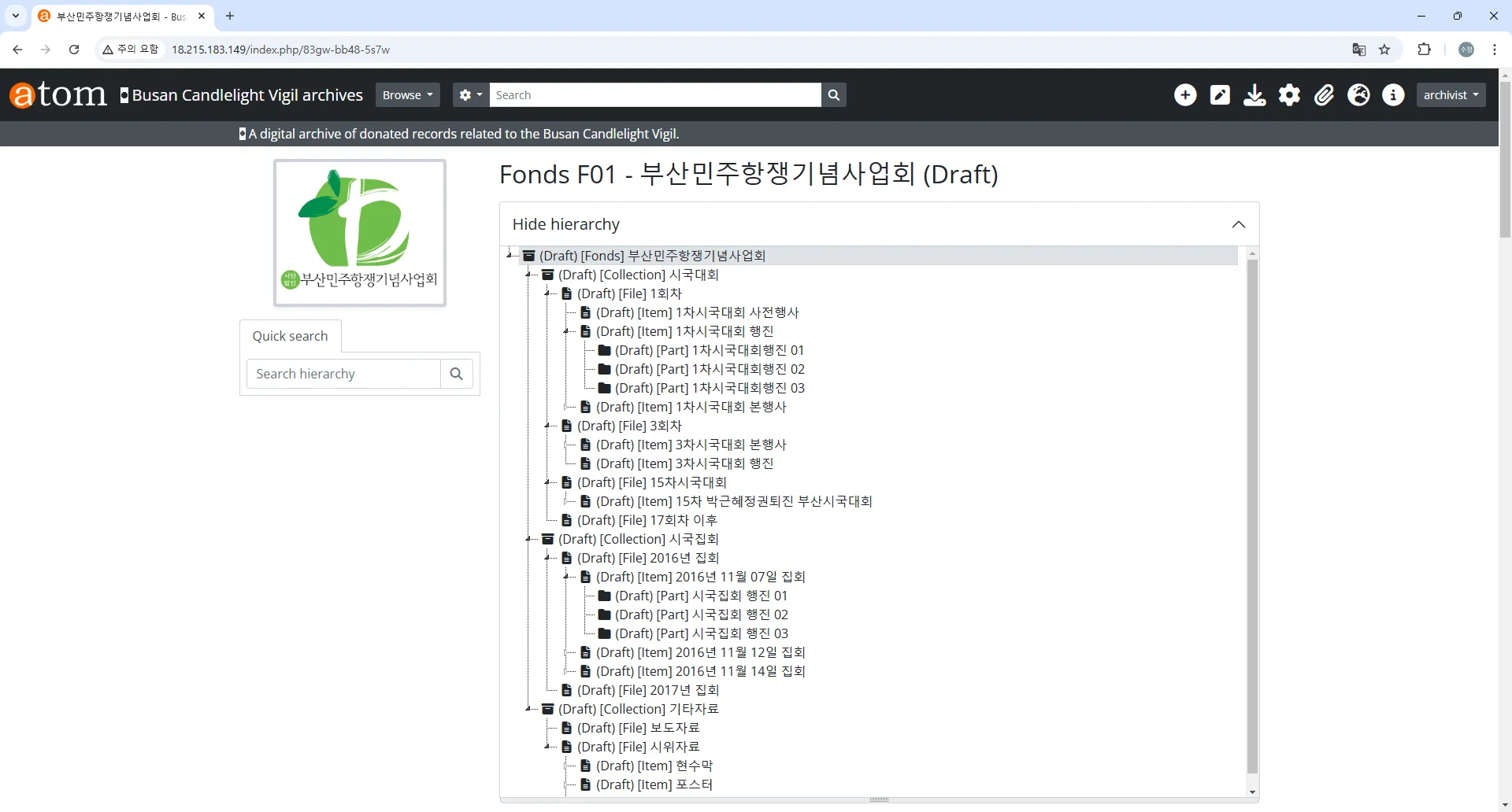 전체 기록물 계층 구조 확인: http://18.215.183.149/index.php/browse/hierarchy