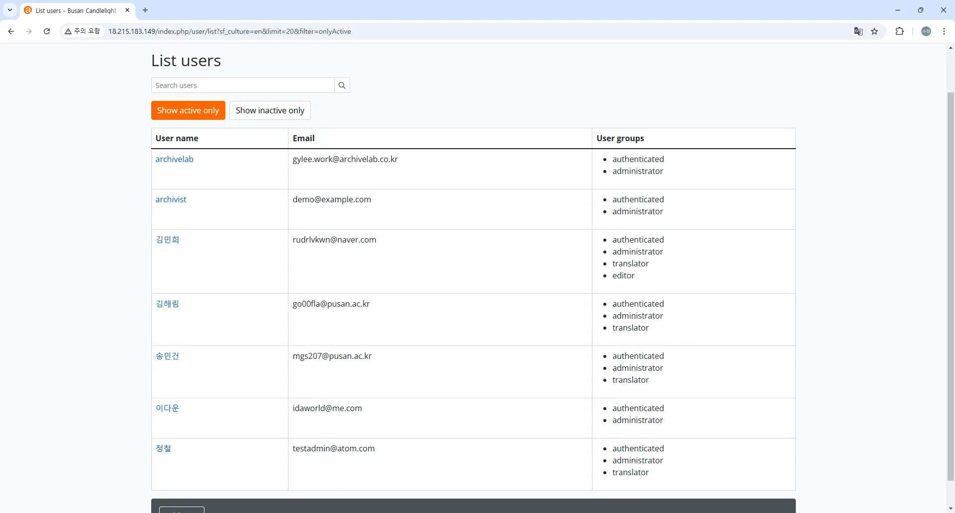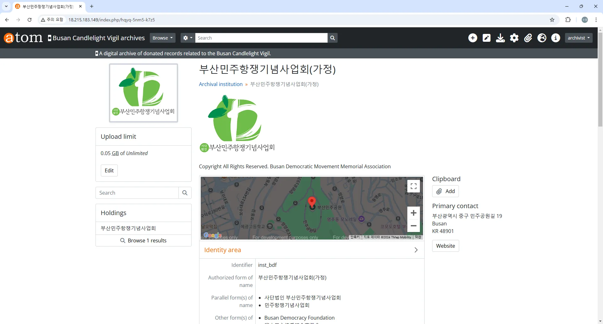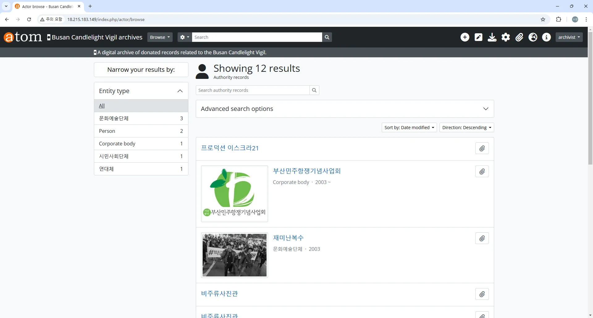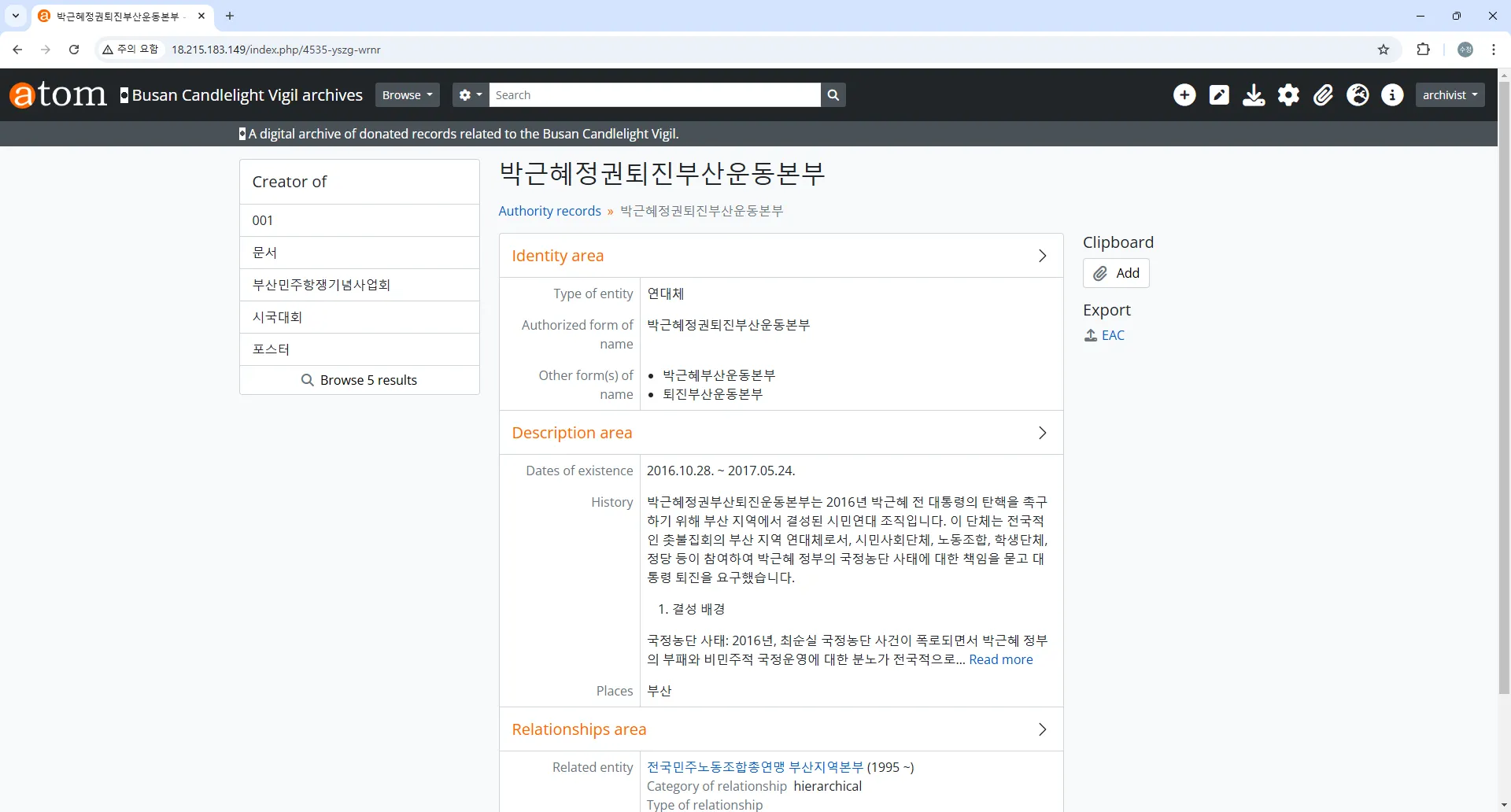 전체 기록물 계층 구조 확인: http://18.215.183.149/index.php/browse/hierarchy