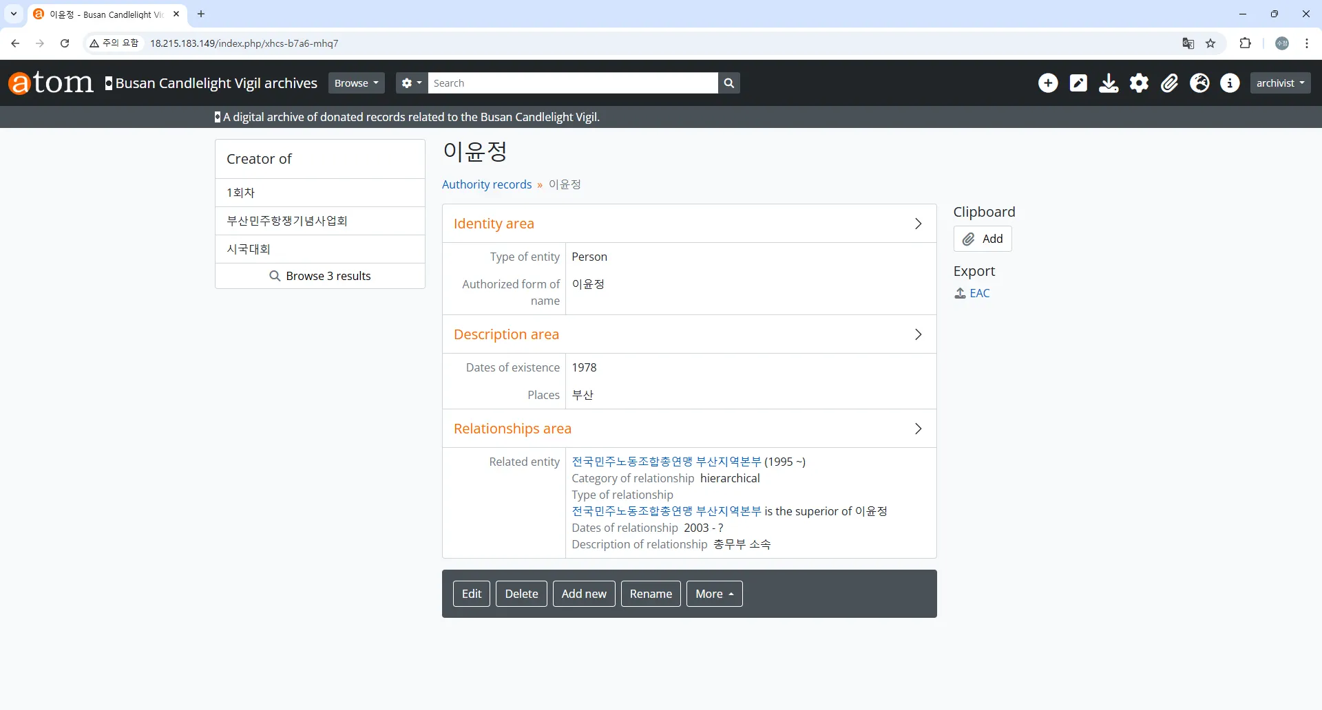 전체 소장기록 목록을 CSV와 EAD로 반출해 놓기 Archival description > Export > EAD 2002 XML
