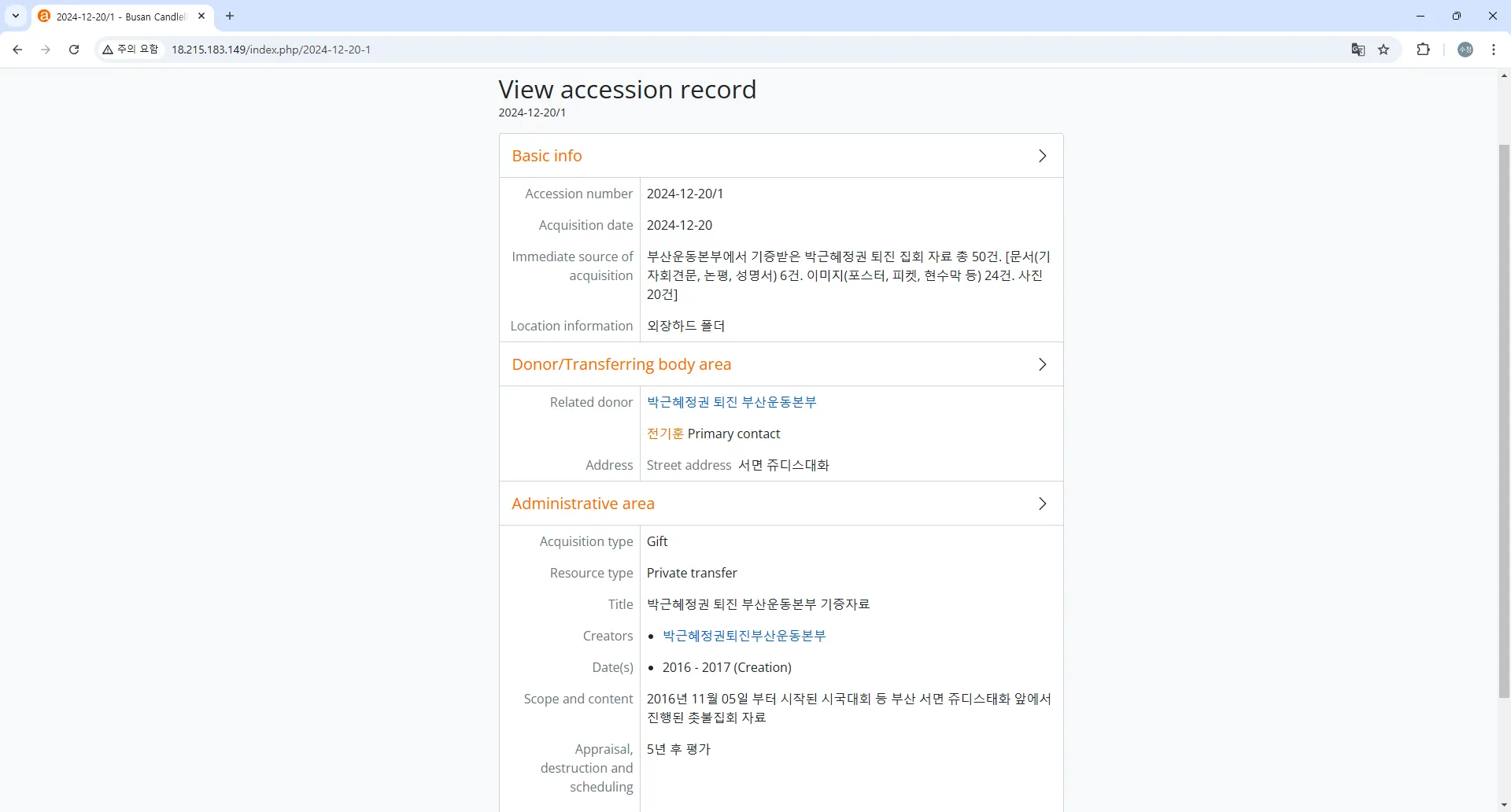 기증자: 박근혜정권 퇴진 부산운동본부, 부산여성시국회의 등, 이스크라21, 비주류사진관, 개인 등