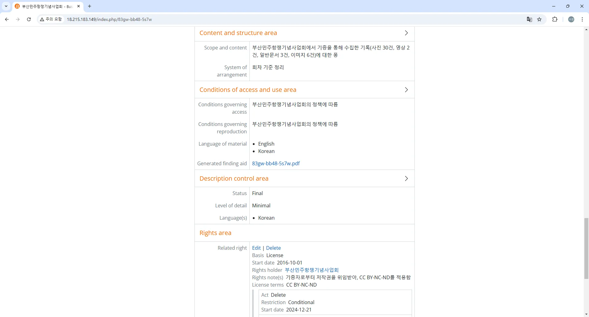 컬렉션별 Finding Aids 업로드 Archival description > Finding aid > Upload